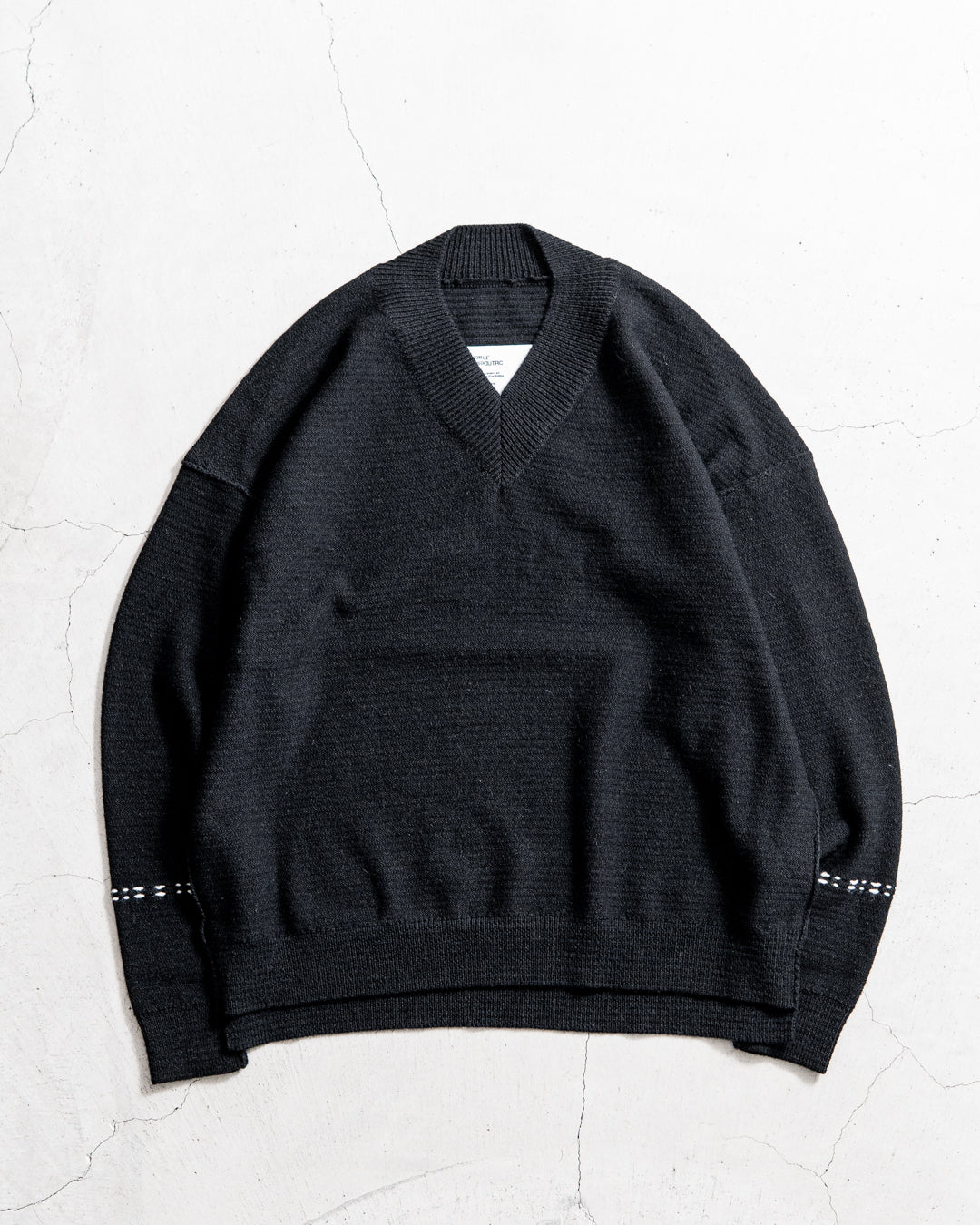 アルパカとウールのボーダーを 裏使いしたVネックニット。 目の詰まったもっちりとした肉感で、 保温性にも優れています。 身幅に適度な余白を持たせつつ、 アームをすっきりと設計。 リラックス感がありながらも、 だらしなく見えないバランスに 仕上げました。 縫い目も素材同様にインサイドアウト仕様。 さらに、両袖のステッチにはモールス信号で 「UTRC」の文字を表現しています。