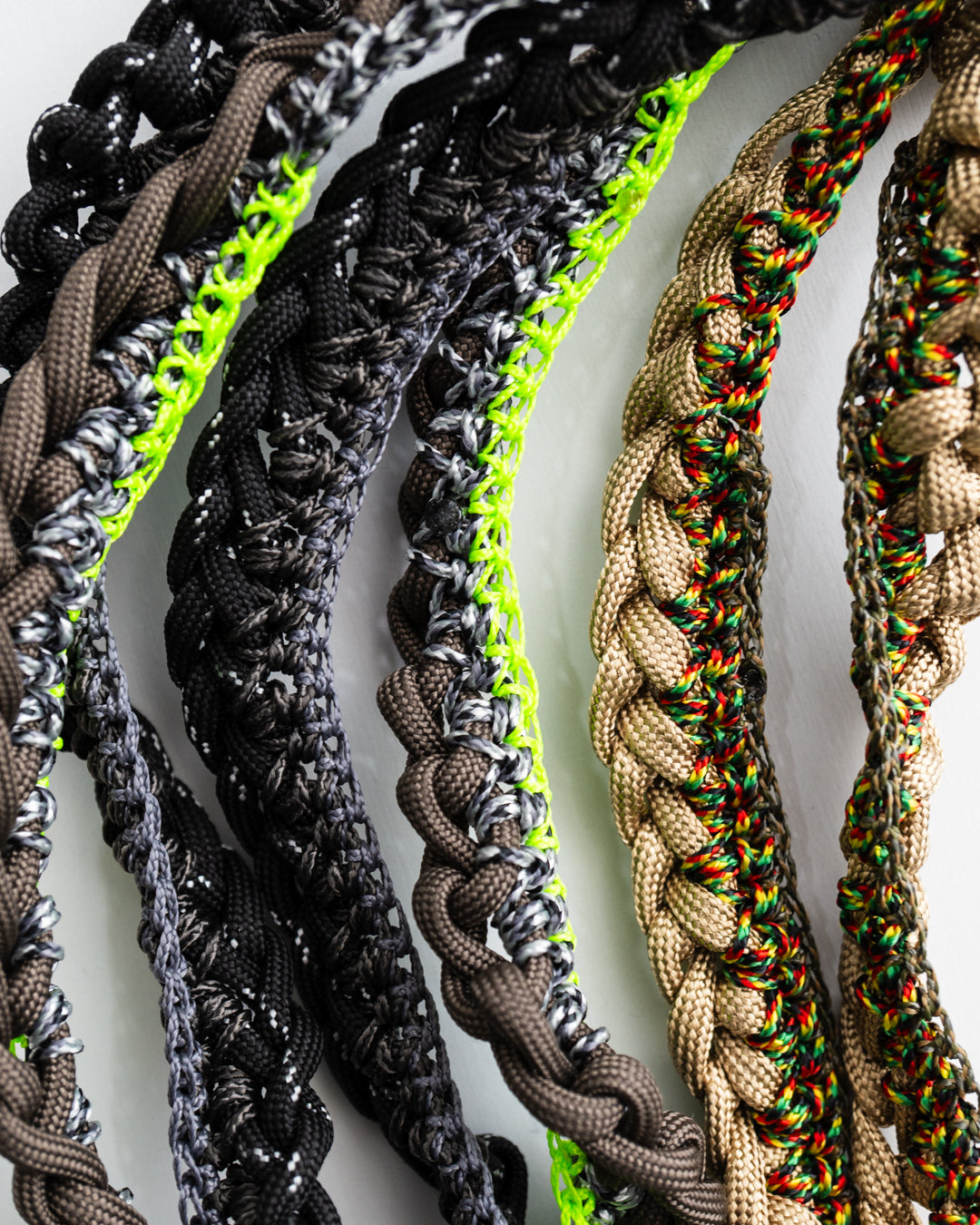 ナイロンのパラコードを様々な配色と編み方で1本のストラップに仕上げた、”CROCHET ROPE" 。
