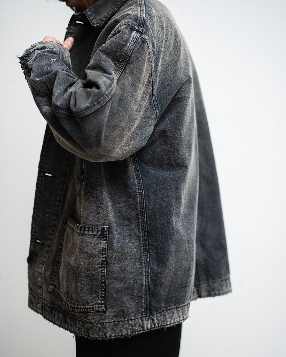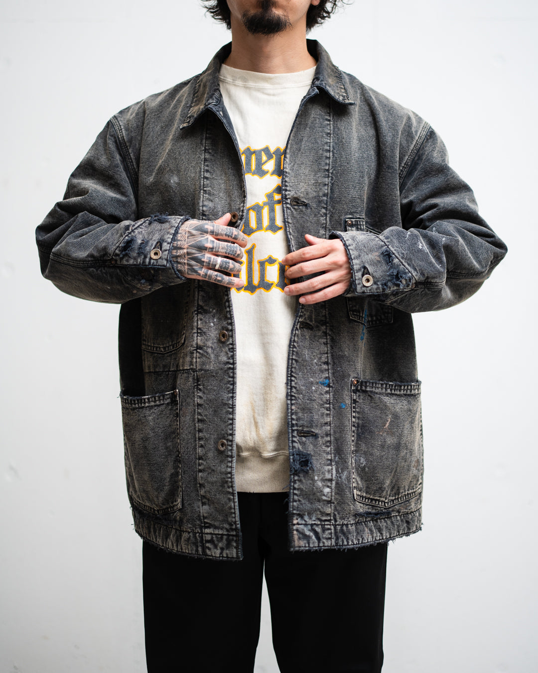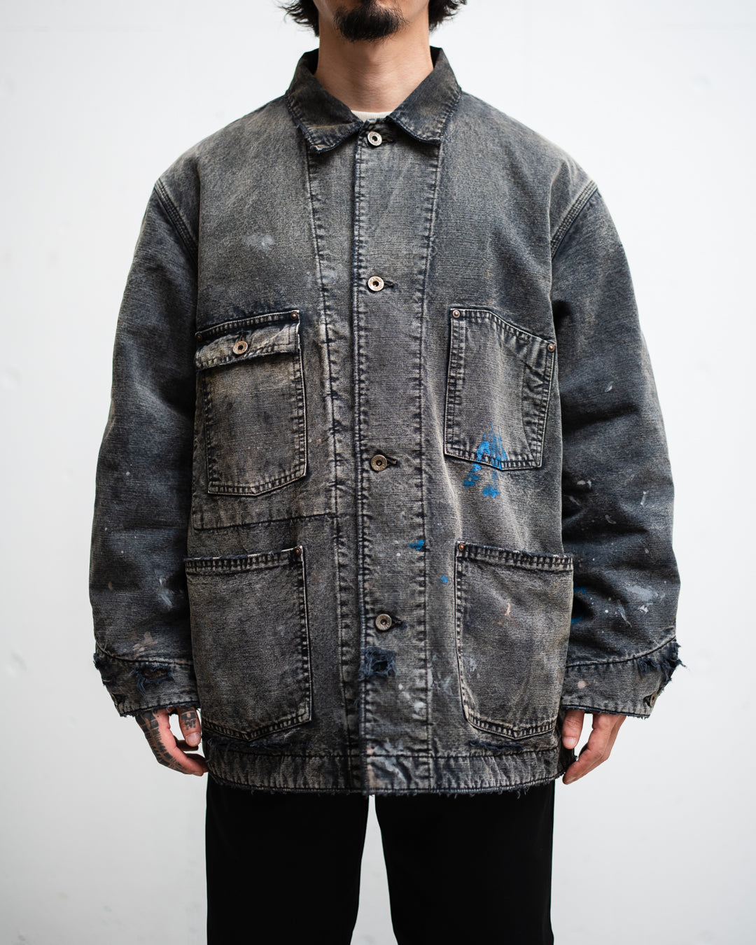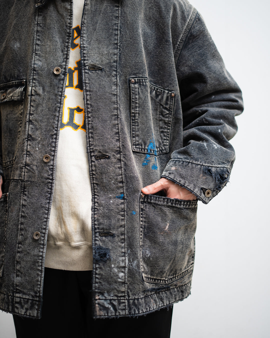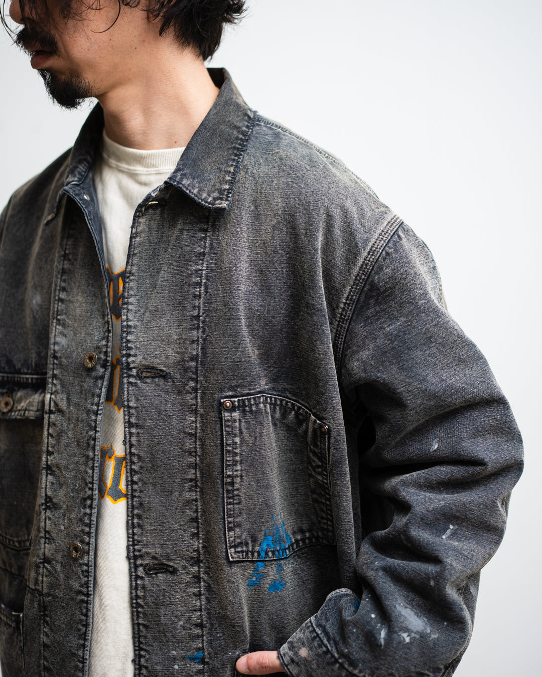 本作は、当時の空気感と完成されたワークウェアのクオリティを現代に落とし込んだ一着。身頃にはヘビーオンスのダック地を、裏地には温もりのブランケットを配し、日々の作業で知らぬ間に付いたペンキ跡や擦れ、味わい深い破れを加工で再現した。