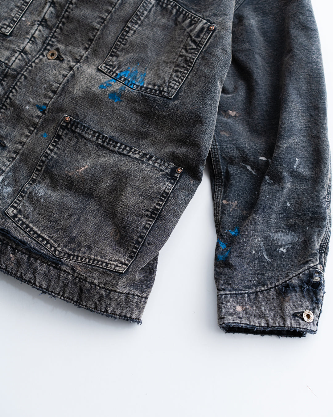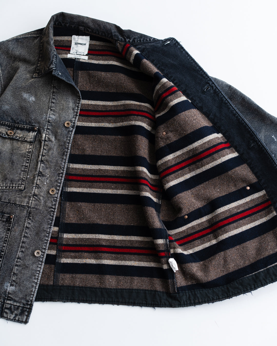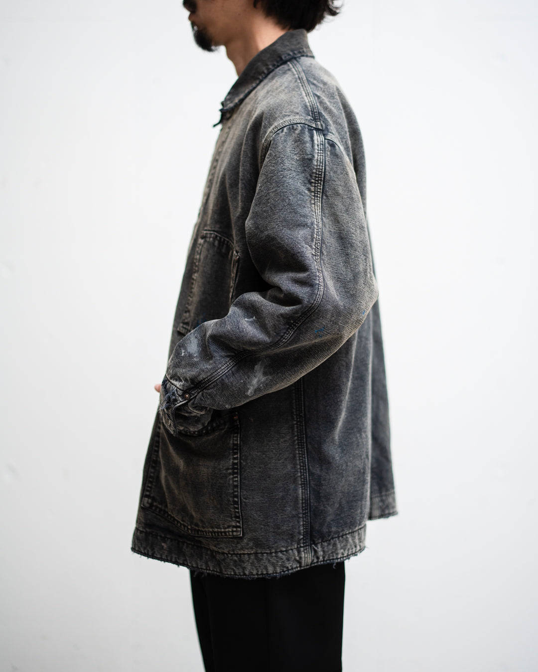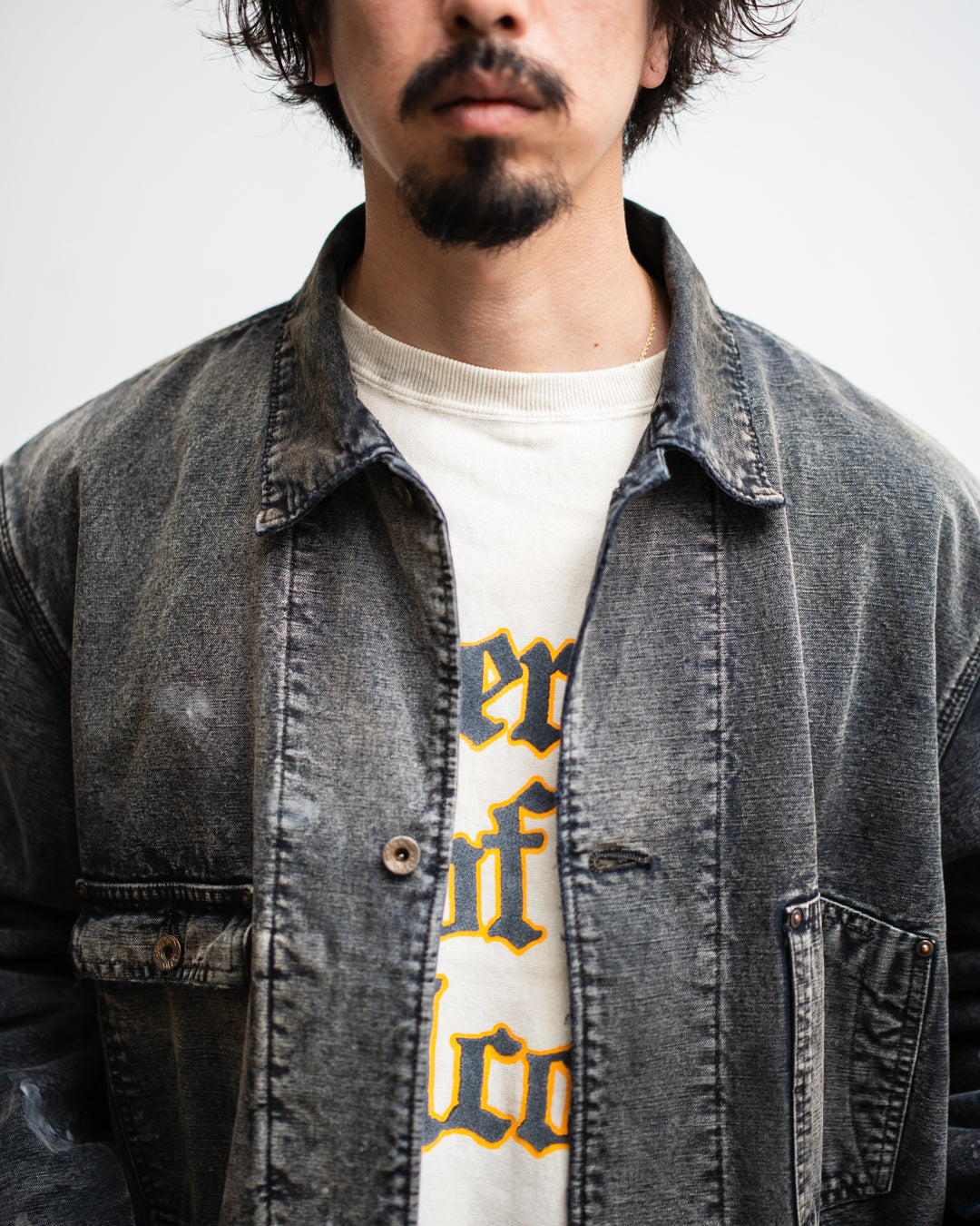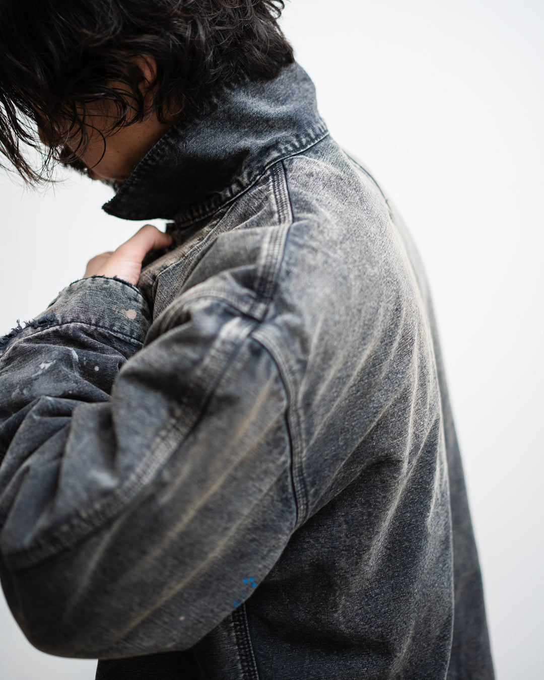 本作は、当時の空気感と完成されたワークウェアのクオリティを現代に落とし込んだ一着。身頃にはヘビーオンスのダック地を、裏地には温もりのブランケットを配し、日々の作業で知らぬ間に付いたペンキ跡や擦れ、味わい深い破れを加工で再現した。