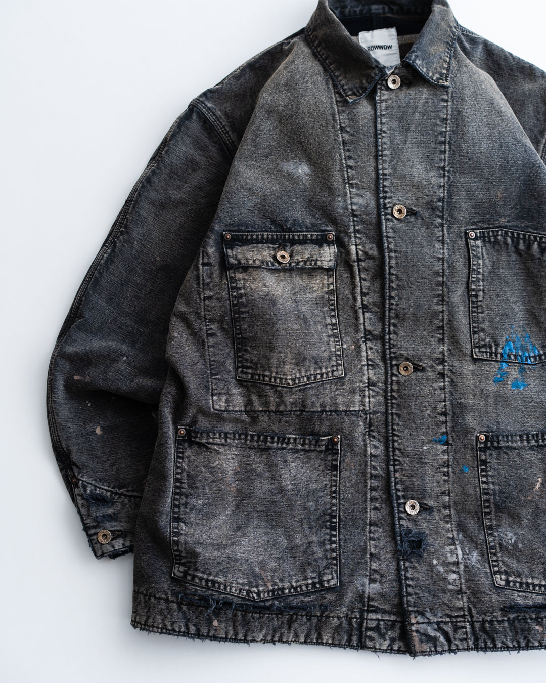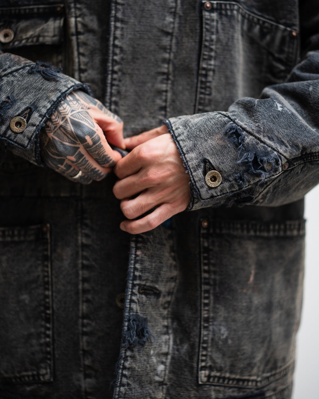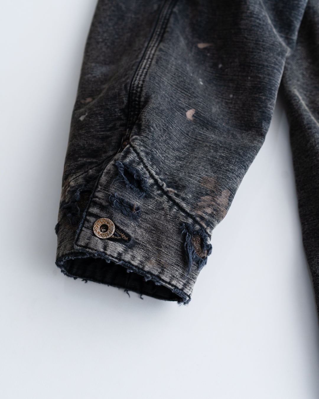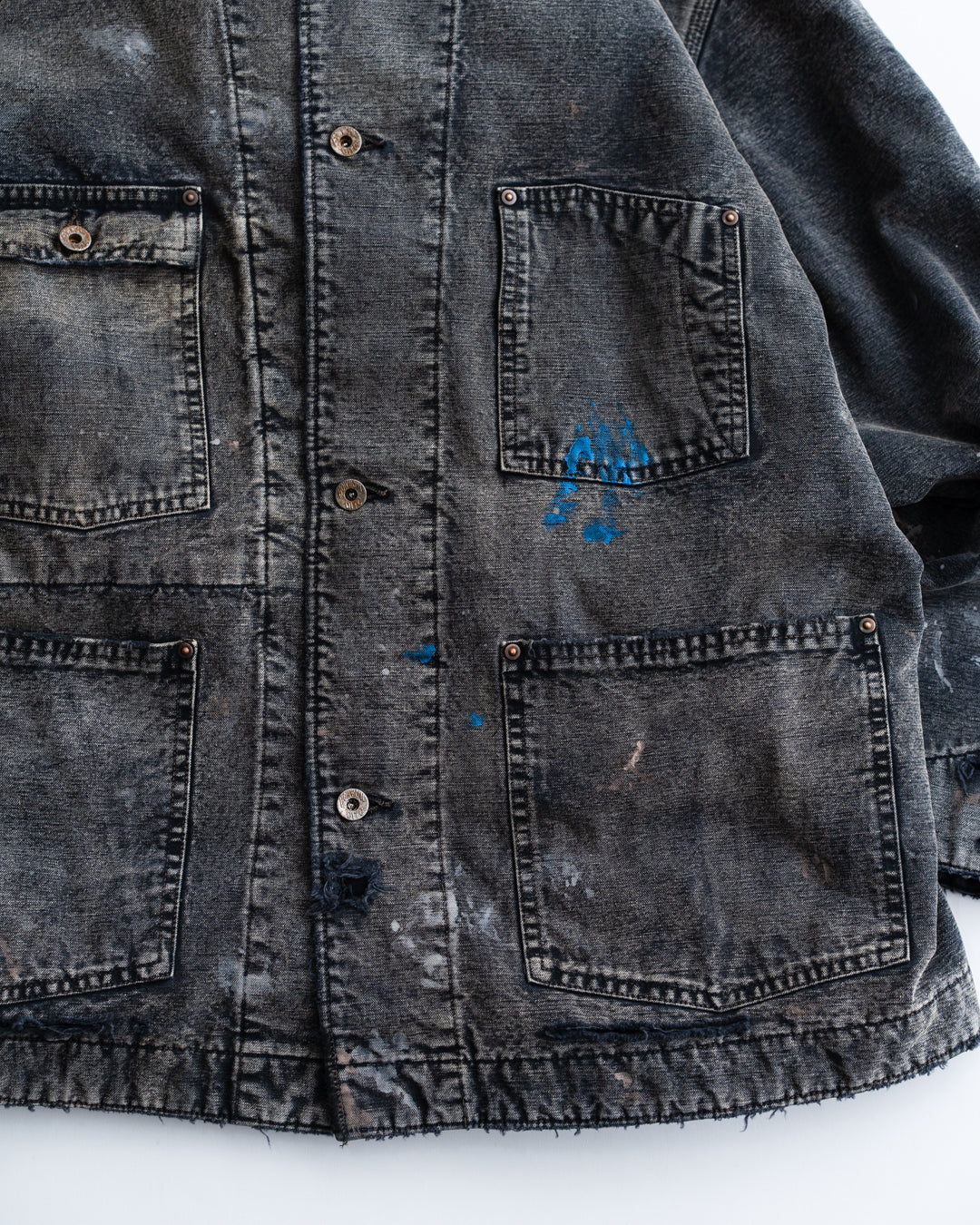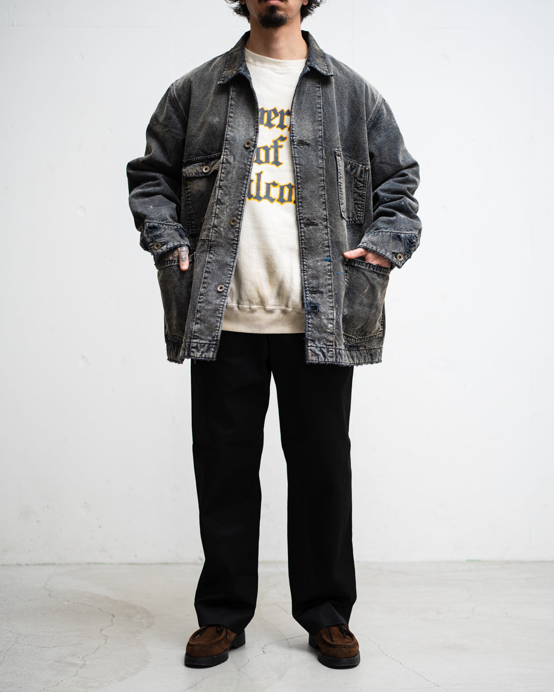 本作は、当時の空気感と完成されたワークウェアのクオリティを現代に落とし込んだ一着。身頃にはヘビーオンスのダック地を、裏地には温もりのブランケットを配し、日々の作業で知らぬ間に付いたペンキ跡や擦れ、味わい深い破れを加工で再現した。