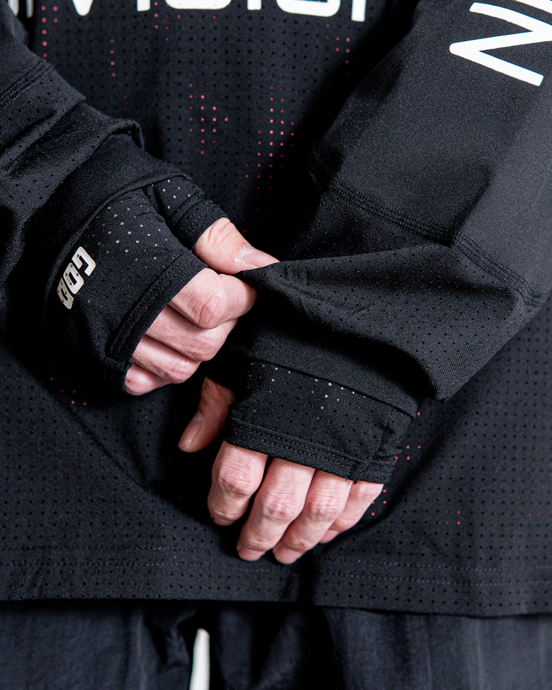 CMF のオリジナル生地ドライドットにて製作。 水の浸透率=吸水速乾力が高い生地ドライドット穴あり・穴なしの2種類の生地で製作。
