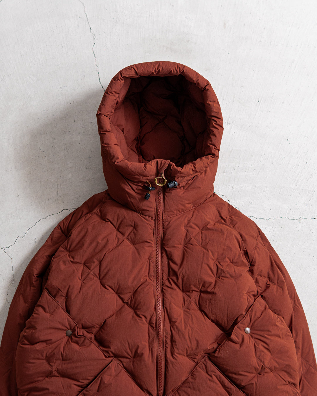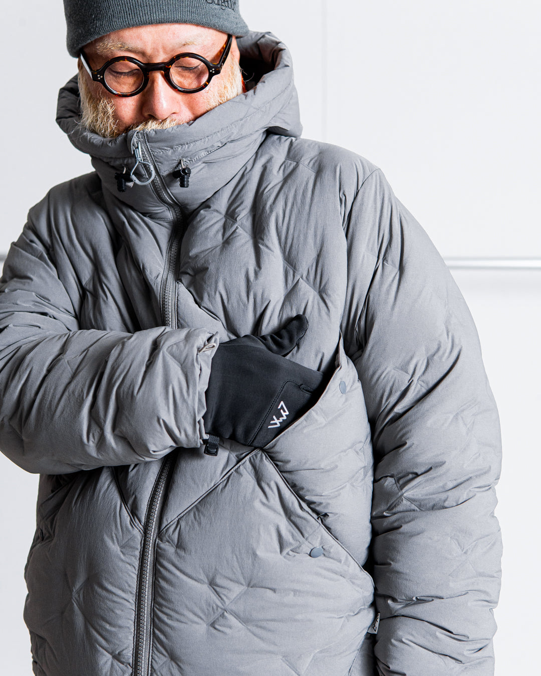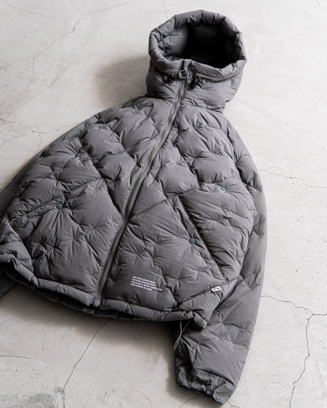 今期は CMF WOVEN という名の表地と裏地をX字に織り合せ、 中にダウン(DOWN 90 FEATHER 10 700FP)を 入れるだけのダウンパック不要の新技術を採用した。 今までのいわゆる圧着ダウンだと経年劣化の際、 圧着部分がはじけそこだけにダウンが溜まってしまい、 以降着れなくなるがこの技術は織で固定しているためそういう問題が起きない。
