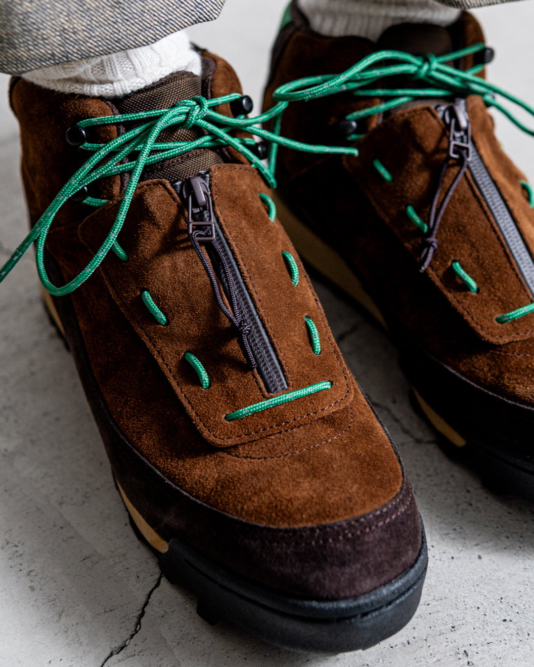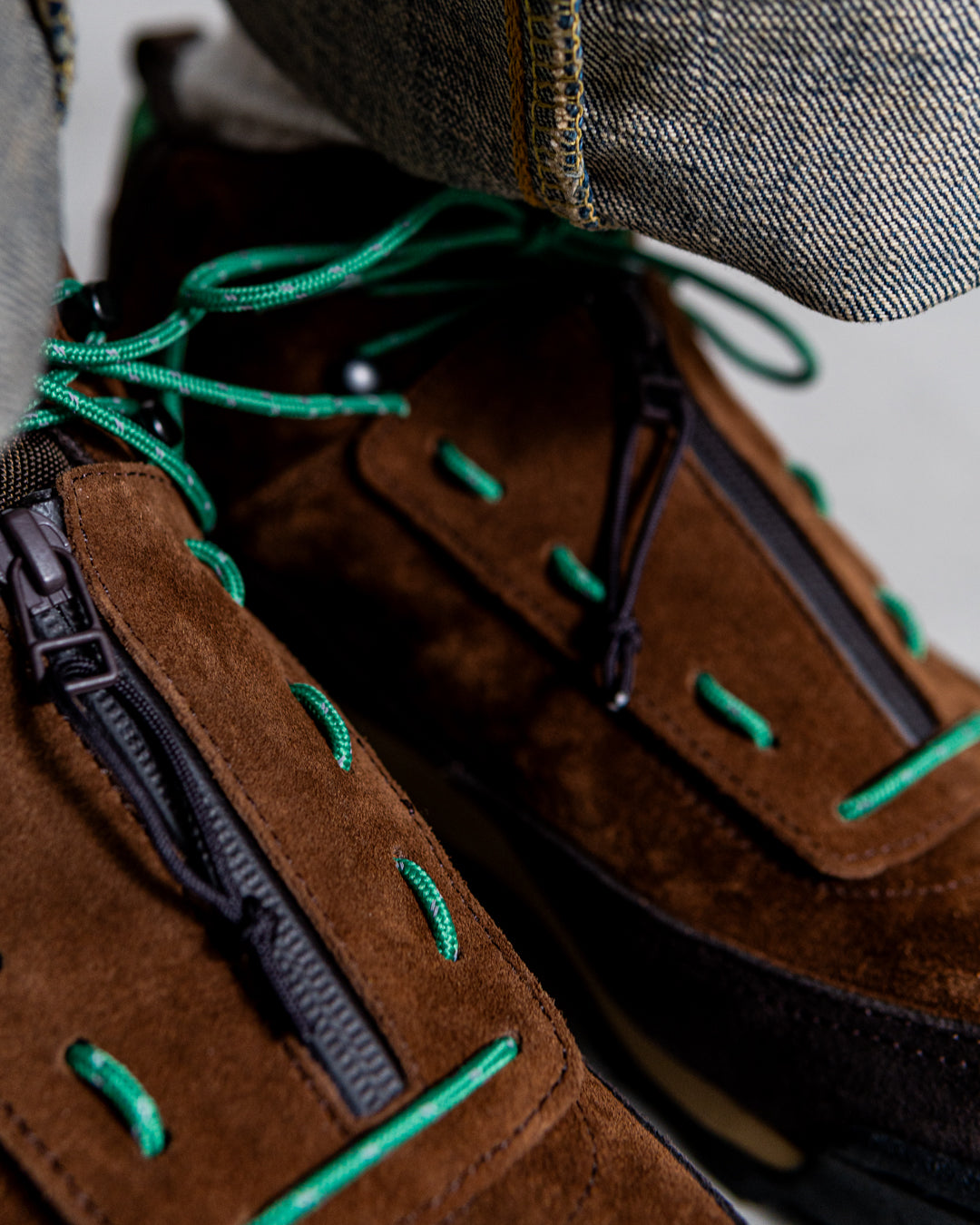 日本のシューズブランド「SUICOKE(スイコック) 」とのコラボレーション。Suicokeの新モデル「Flow-mid-shoes」に、IS-NESSの25年秋冬コレクションとしてシューレースカバー付き別注カラーが登場。シューレースカバーは取り外し可能。