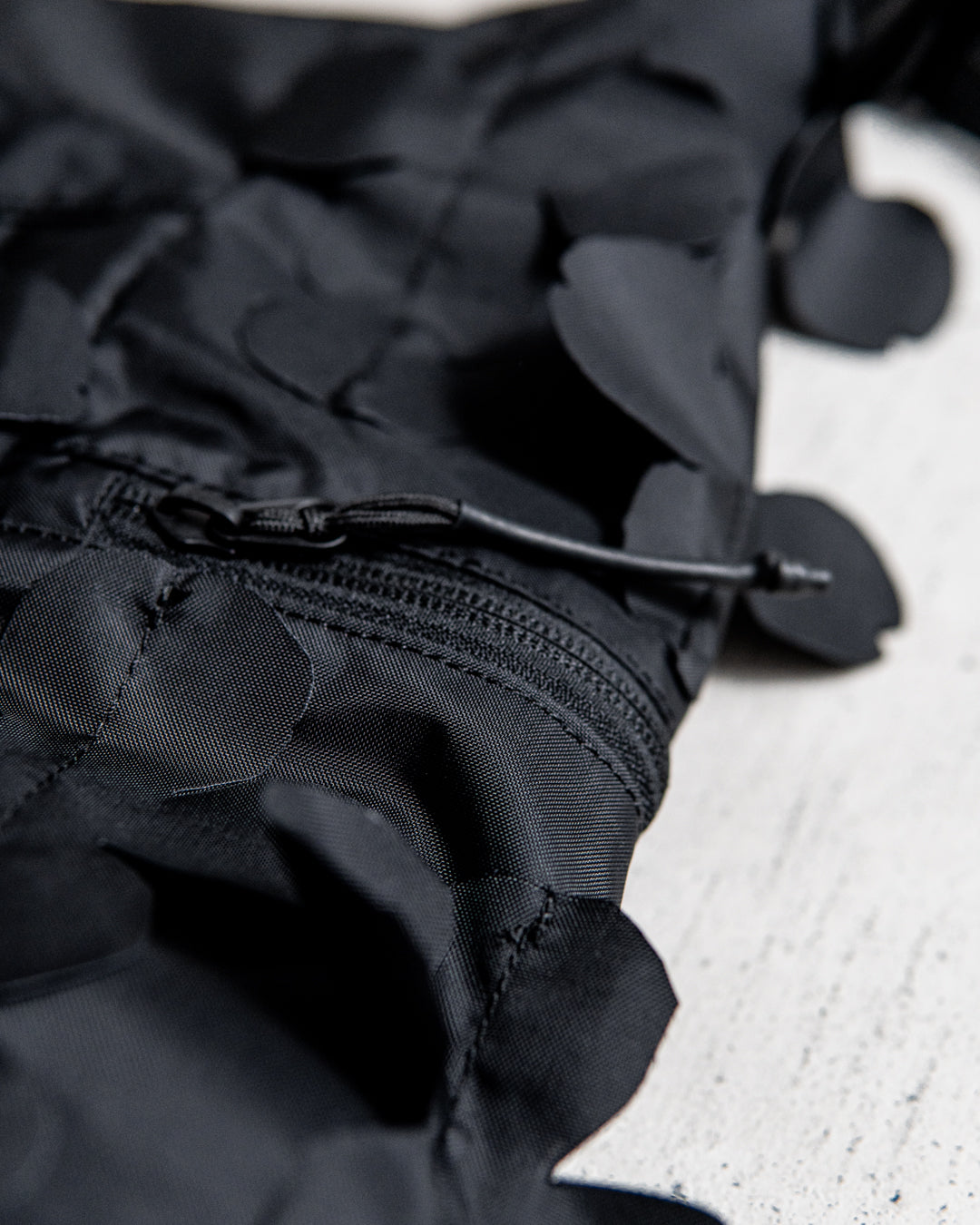 Design: ベルリン発のバックブランド"bagjack"のセカンドラインBAICYCLON by bagjackとのコラボレーション。ギリースーツという特殊な迷彩服に使われているカッティング技法をショルダーバッグに落とし込んだデザイン。四つ葉のクローバーをモチーフとしたオリジナルリーフをレーザーカットで表現しました。背面には長めのジップポケットを配置し収納性を高め、表裏両面で使用できるデザインになっています。
