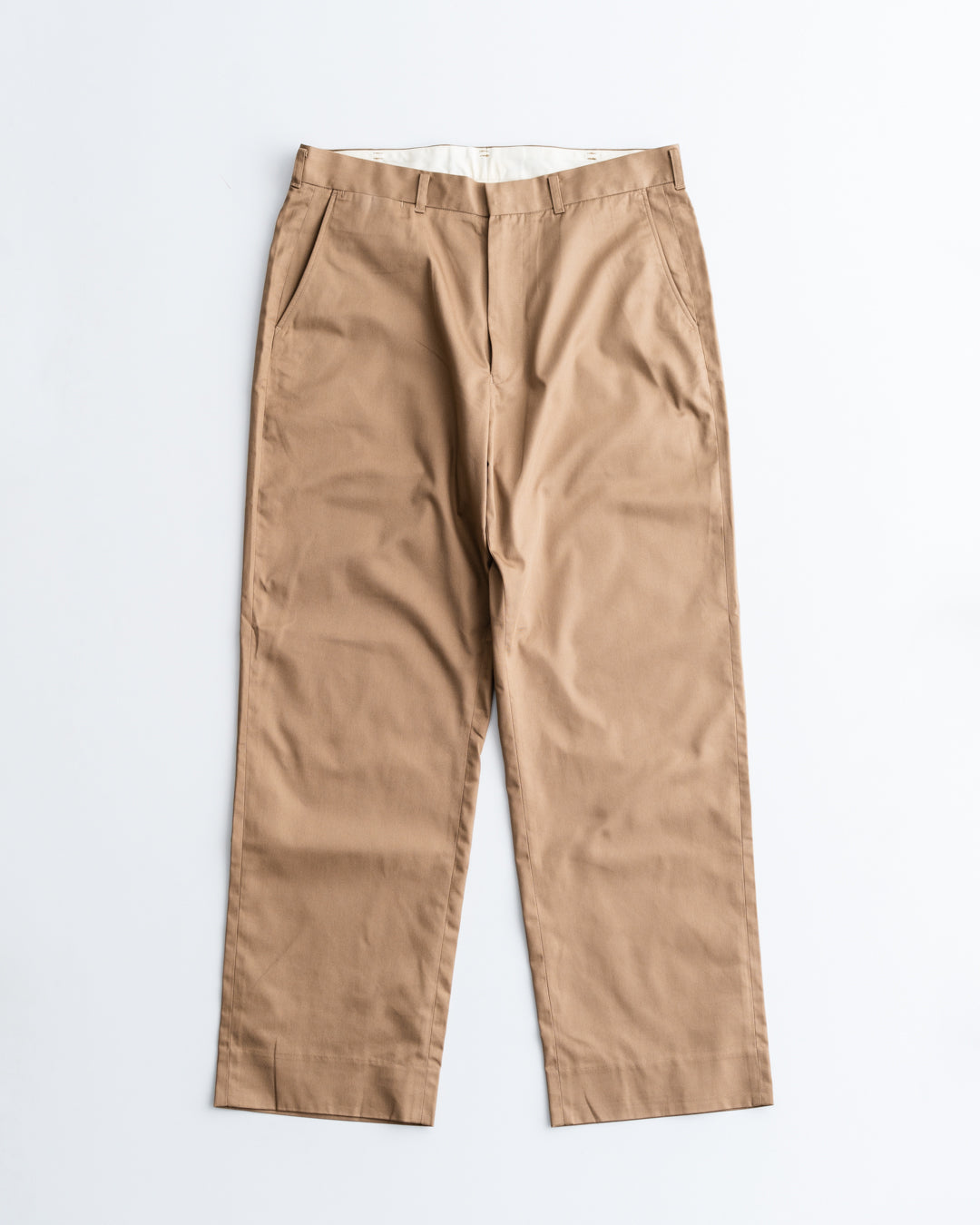 ヴィンテージのワークパンツをベースに製作しました。ややワイドめなシルエット、片玉縁ポケット、シンチバックなどワーク特有のポイントは抑えつつ、TC素材を使用したことで上品かつ軽さが際立つアイテムとなりました。動いた際のドレープも綺麗にでます。