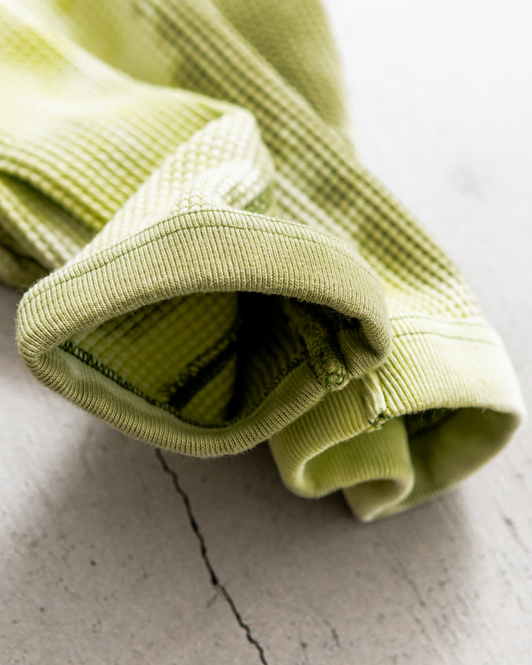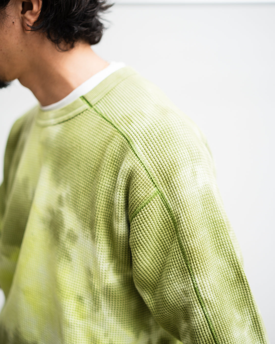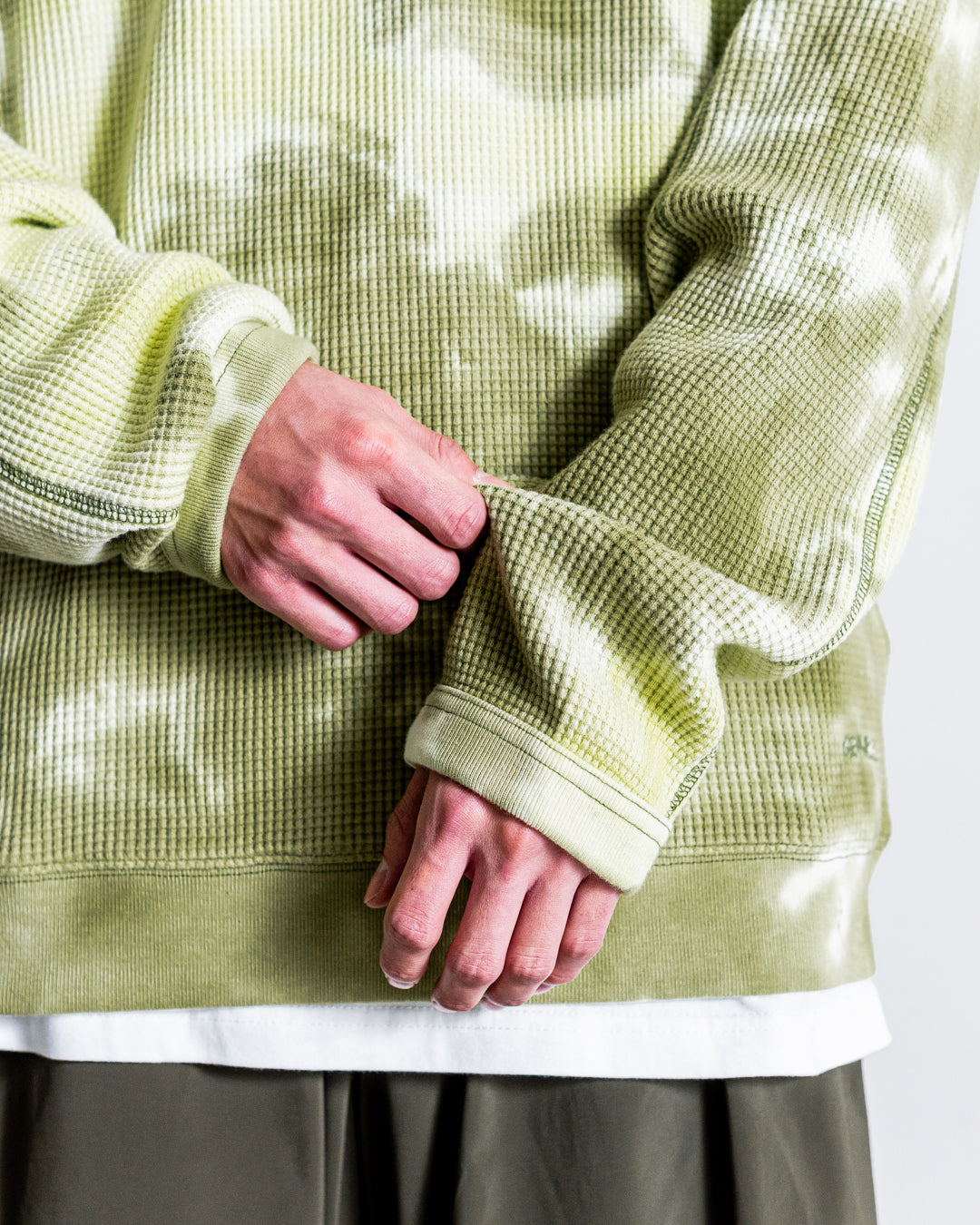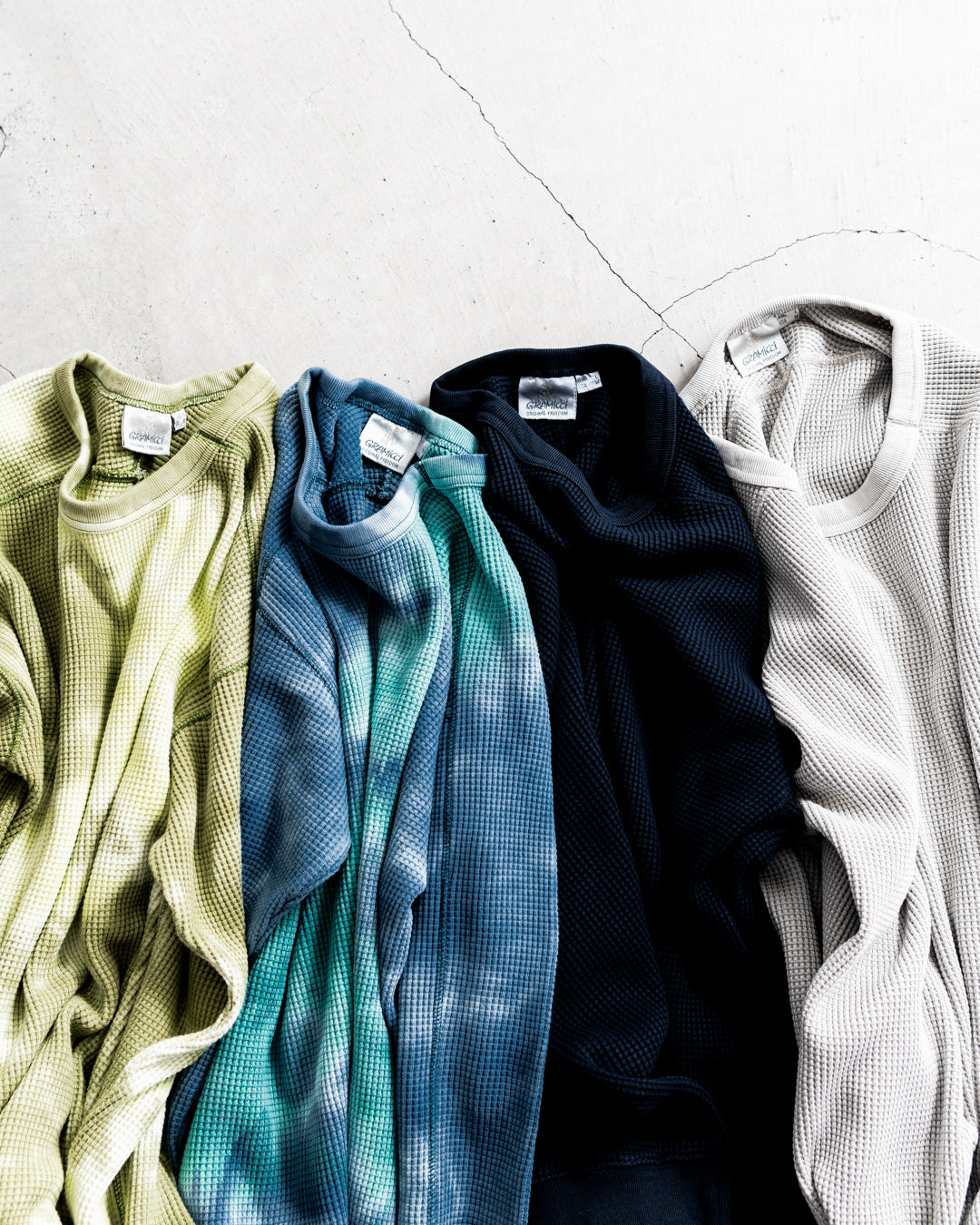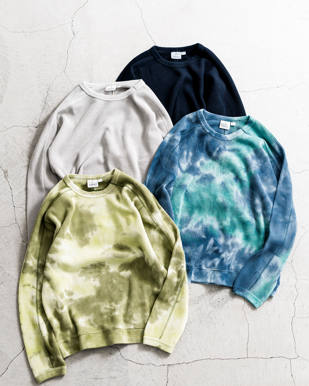 その名の通りワッフルのような凹凸のあるニットは、しっかりした厚みがありながら、とても柔軟で吸水性に優れています。袖口と裾はリブ仕様になっています。雰囲気のあるソリッドカラーとタイダイによる色展開です。