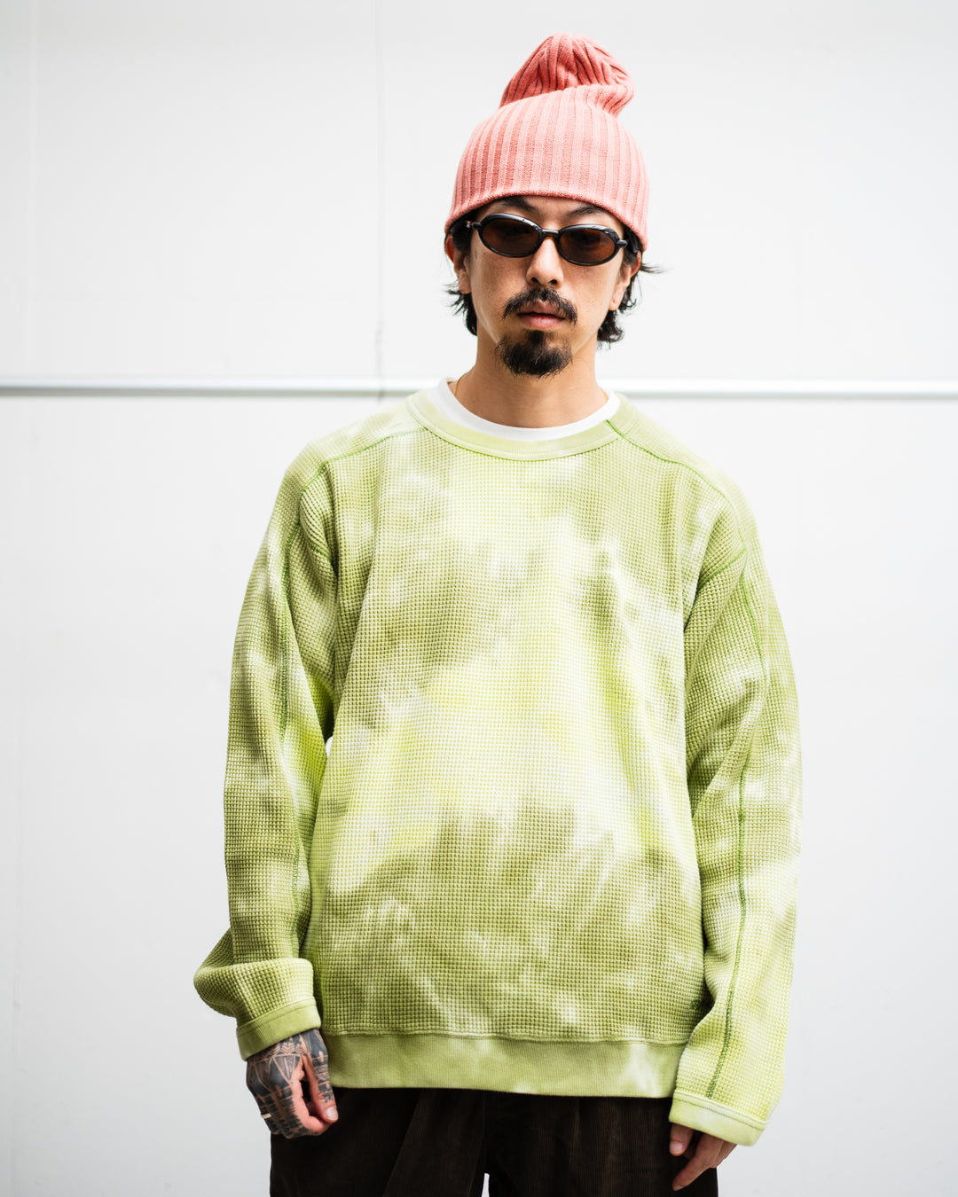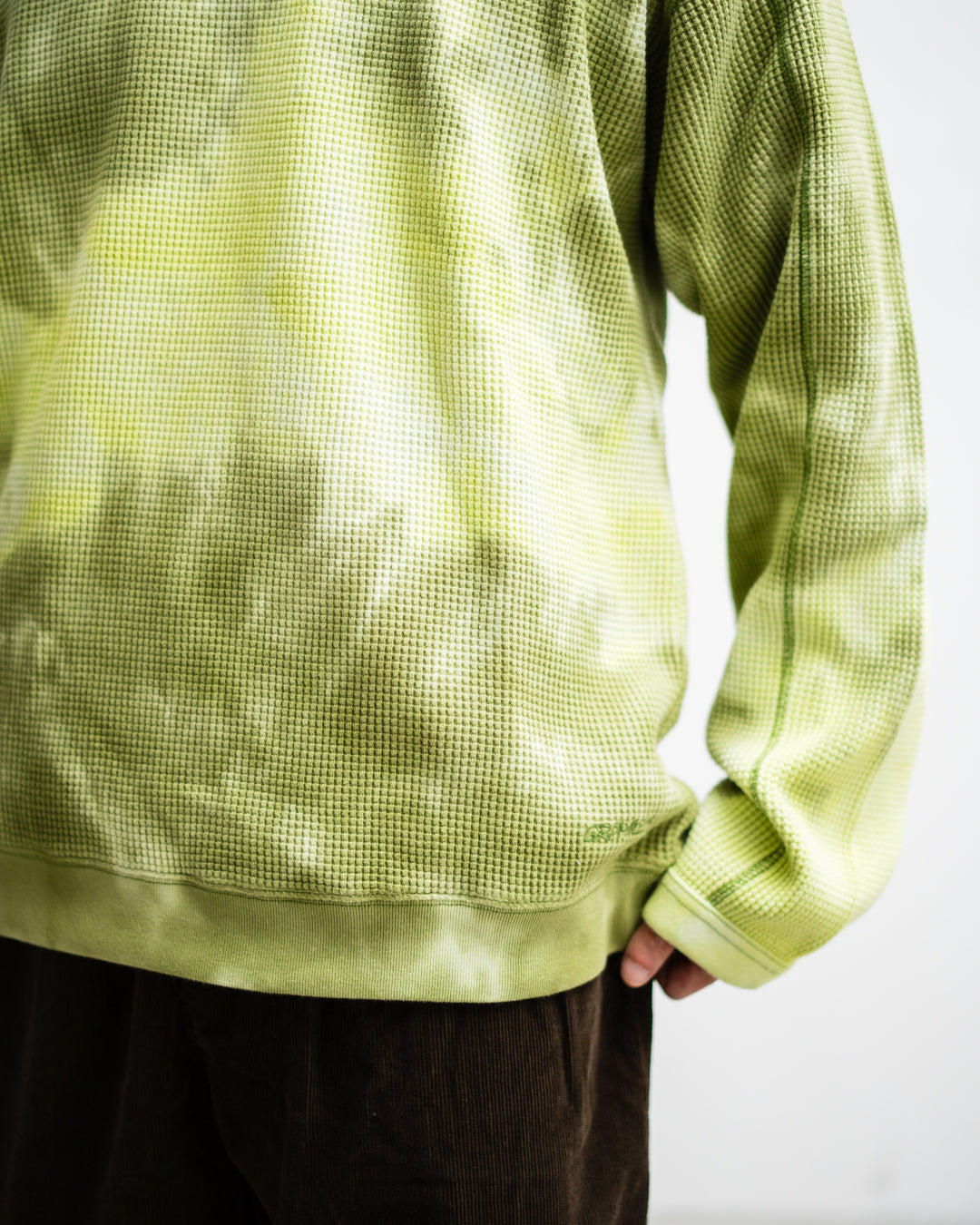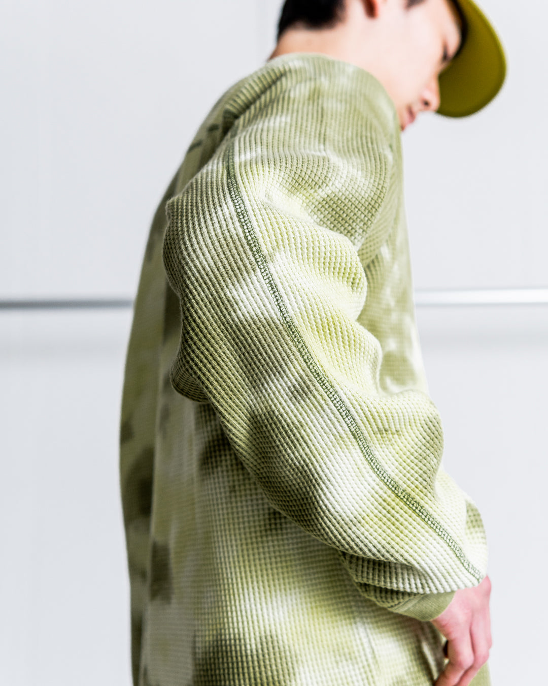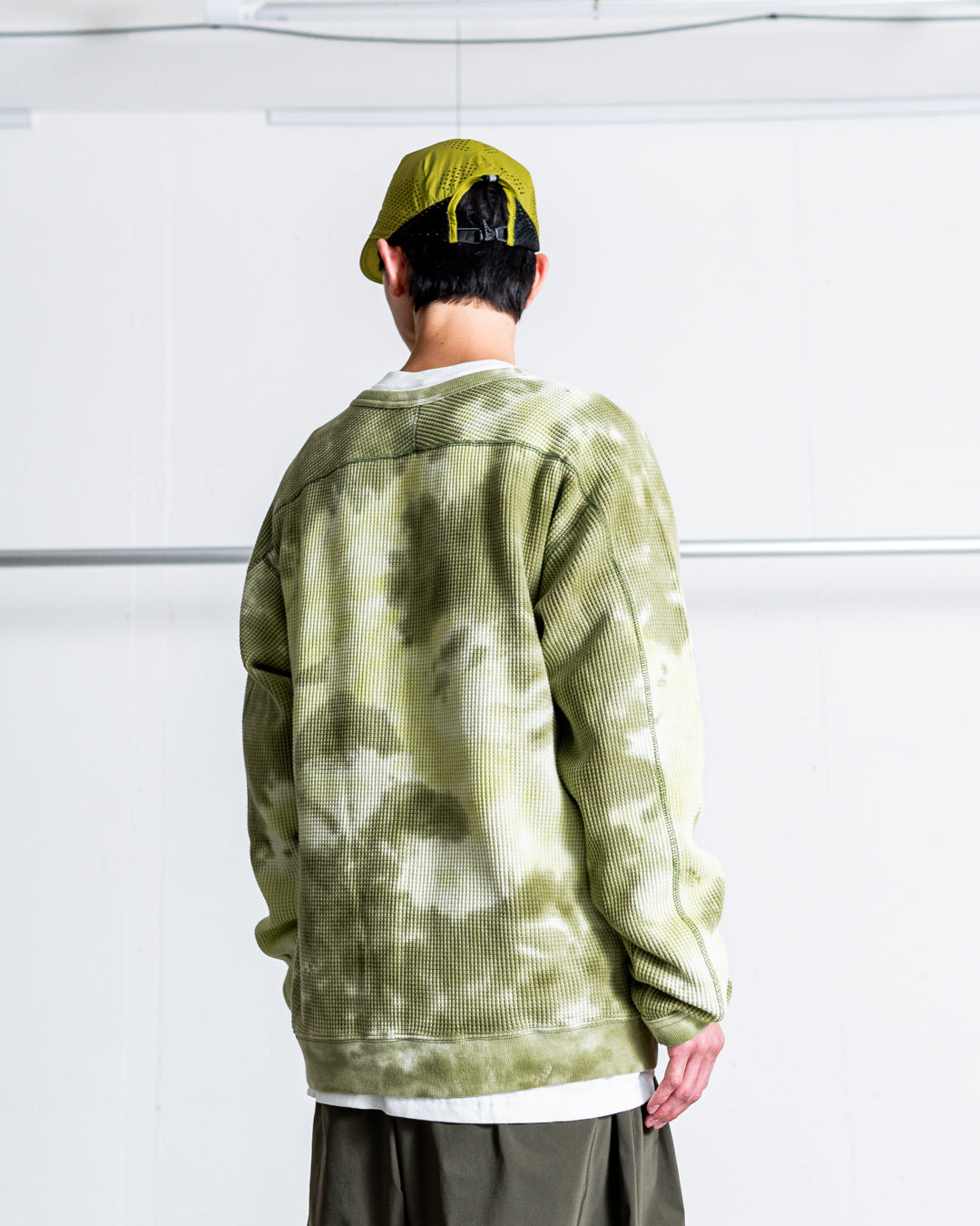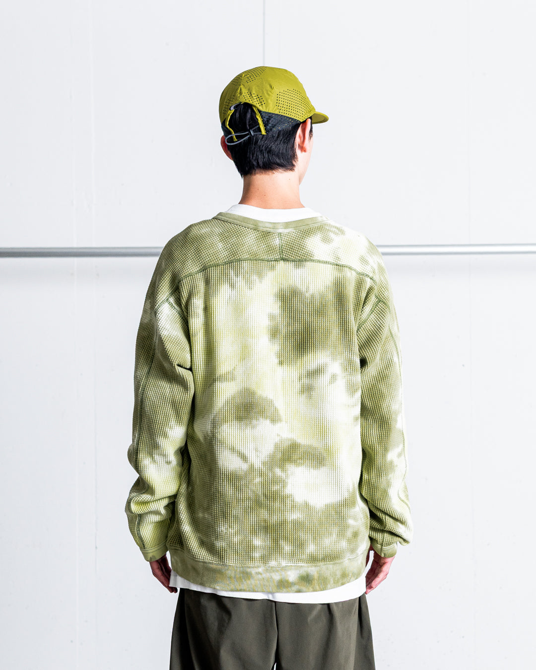 その名の通りワッフルのような凹凸のあるニットは、しっかりした厚みがありながら、とても柔軟で吸水性に優れています。袖口と裾はリブ仕様になっています。雰囲気のあるソリッドカラーとタイダイによる色展開です。