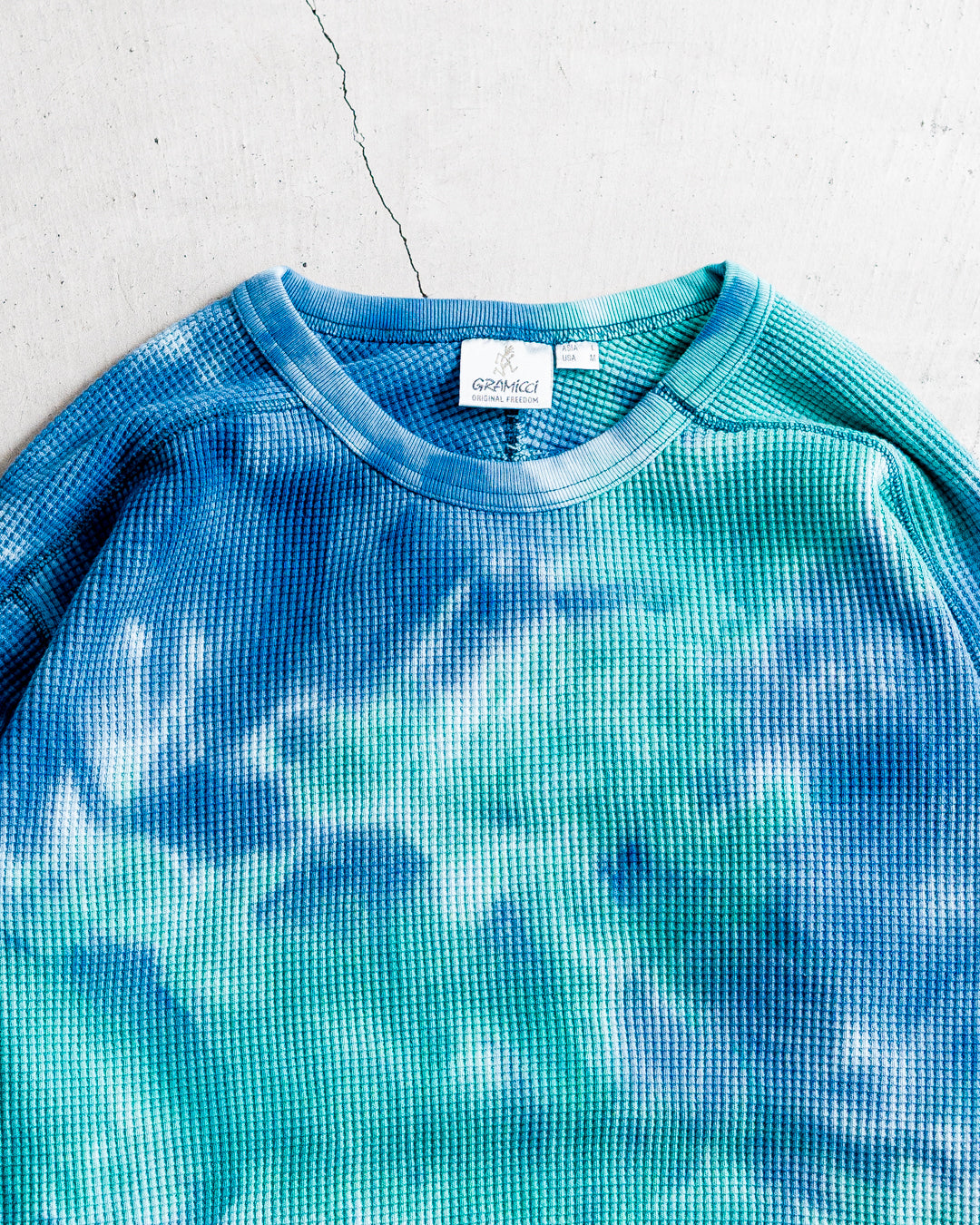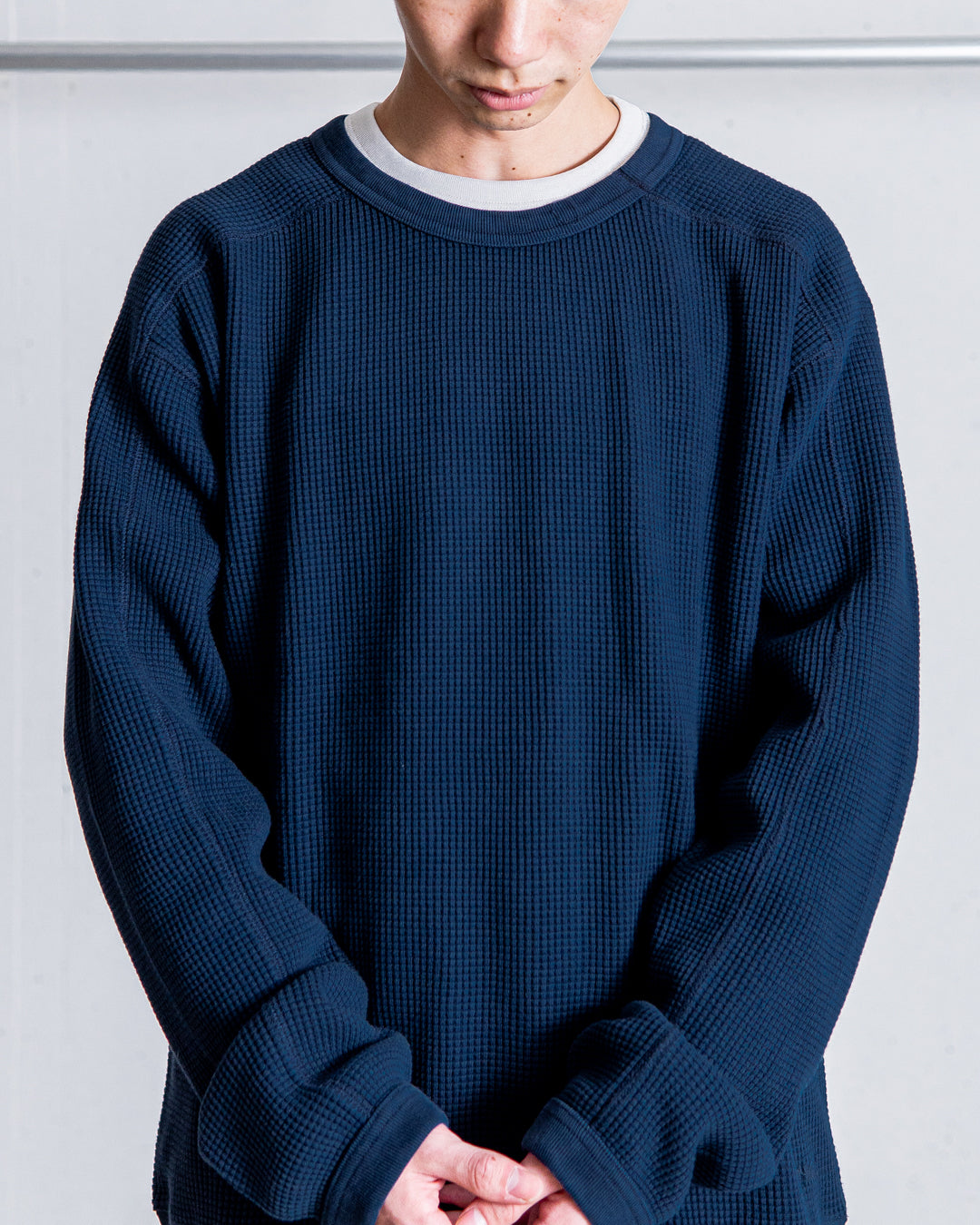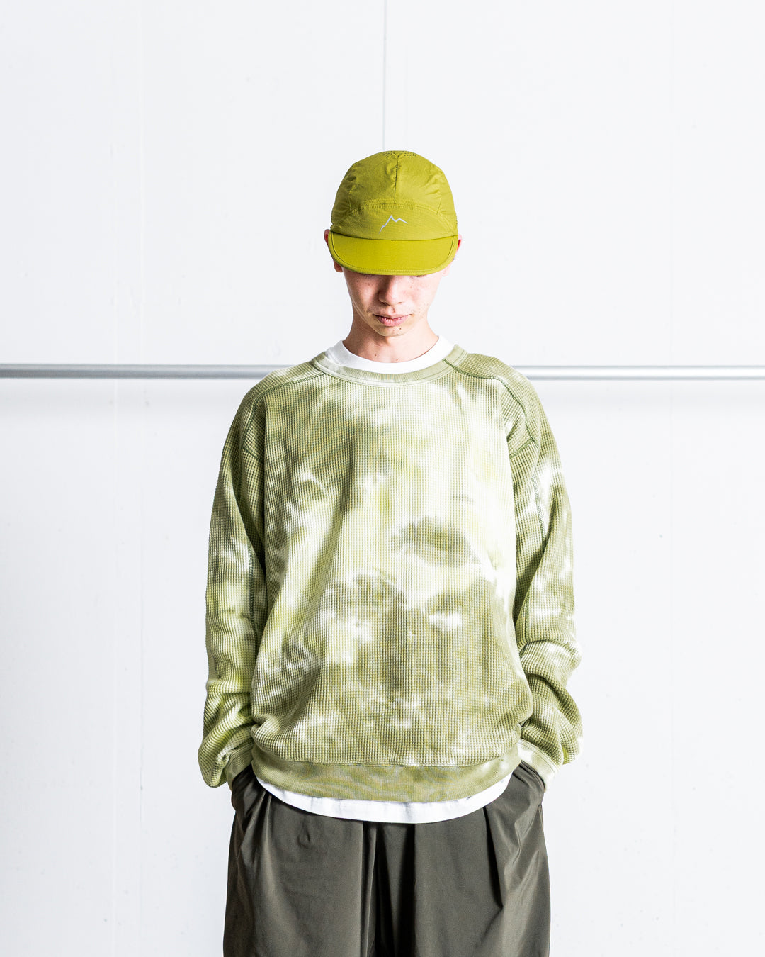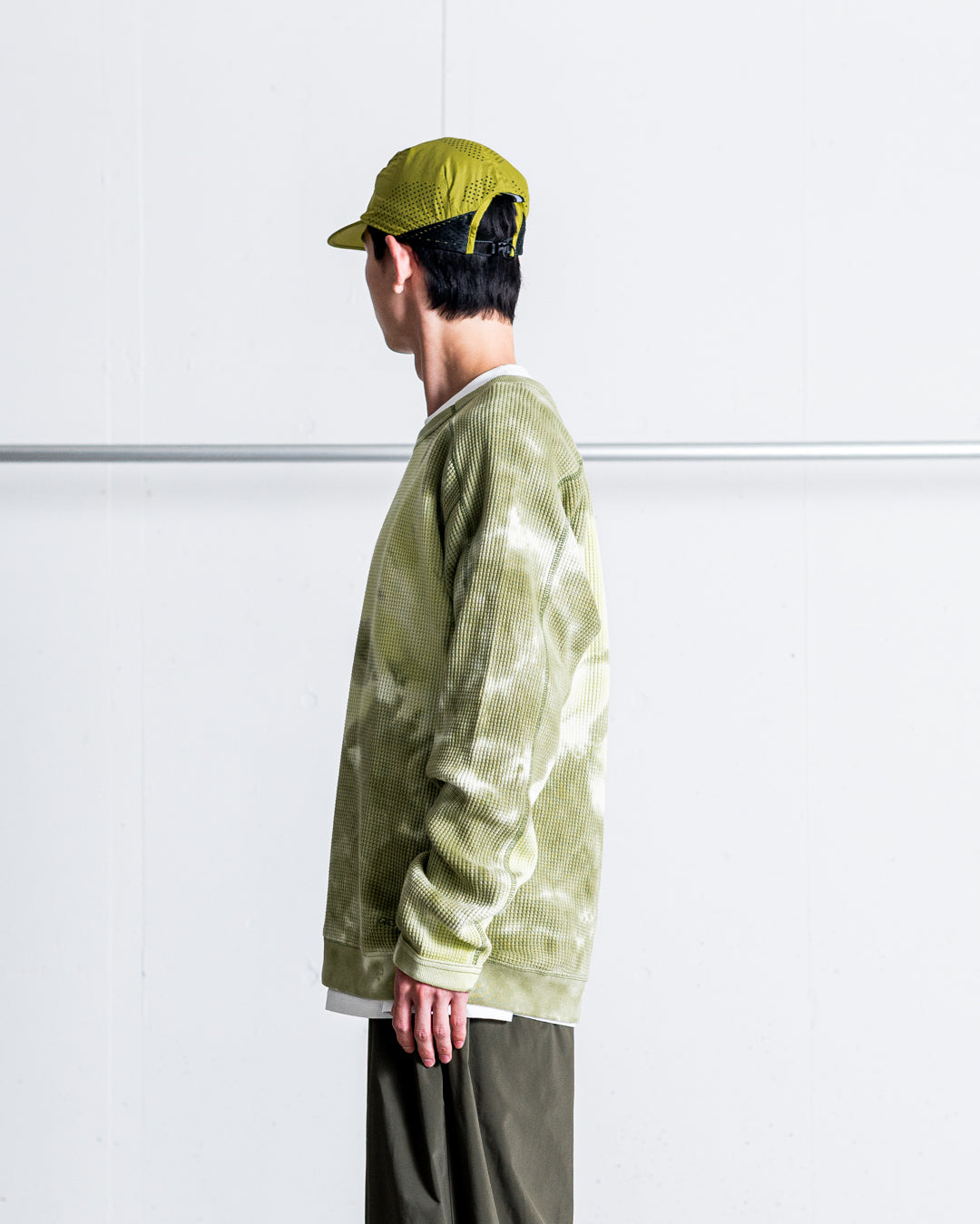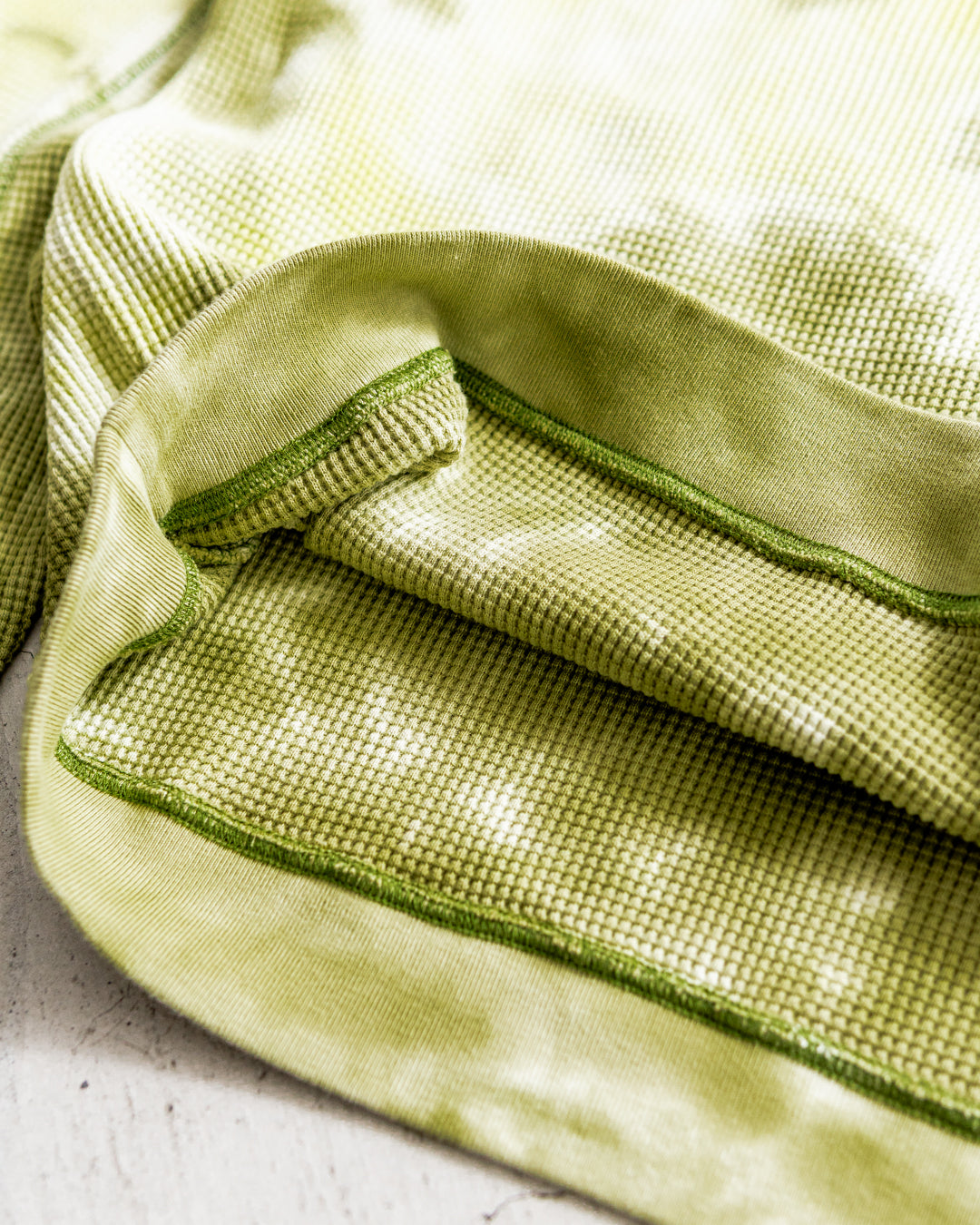 その名の通りワッフルのような凹凸のあるニットは、しっかりした厚みがありながら、とても柔軟で吸水性に優れています。袖口と裾はリブ仕様になっています。雰囲気のあるソリッドカラーとタイダイによる色展開です。