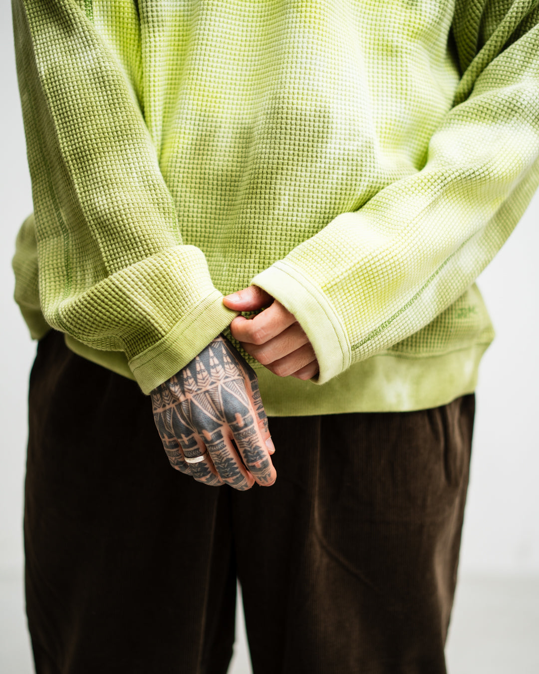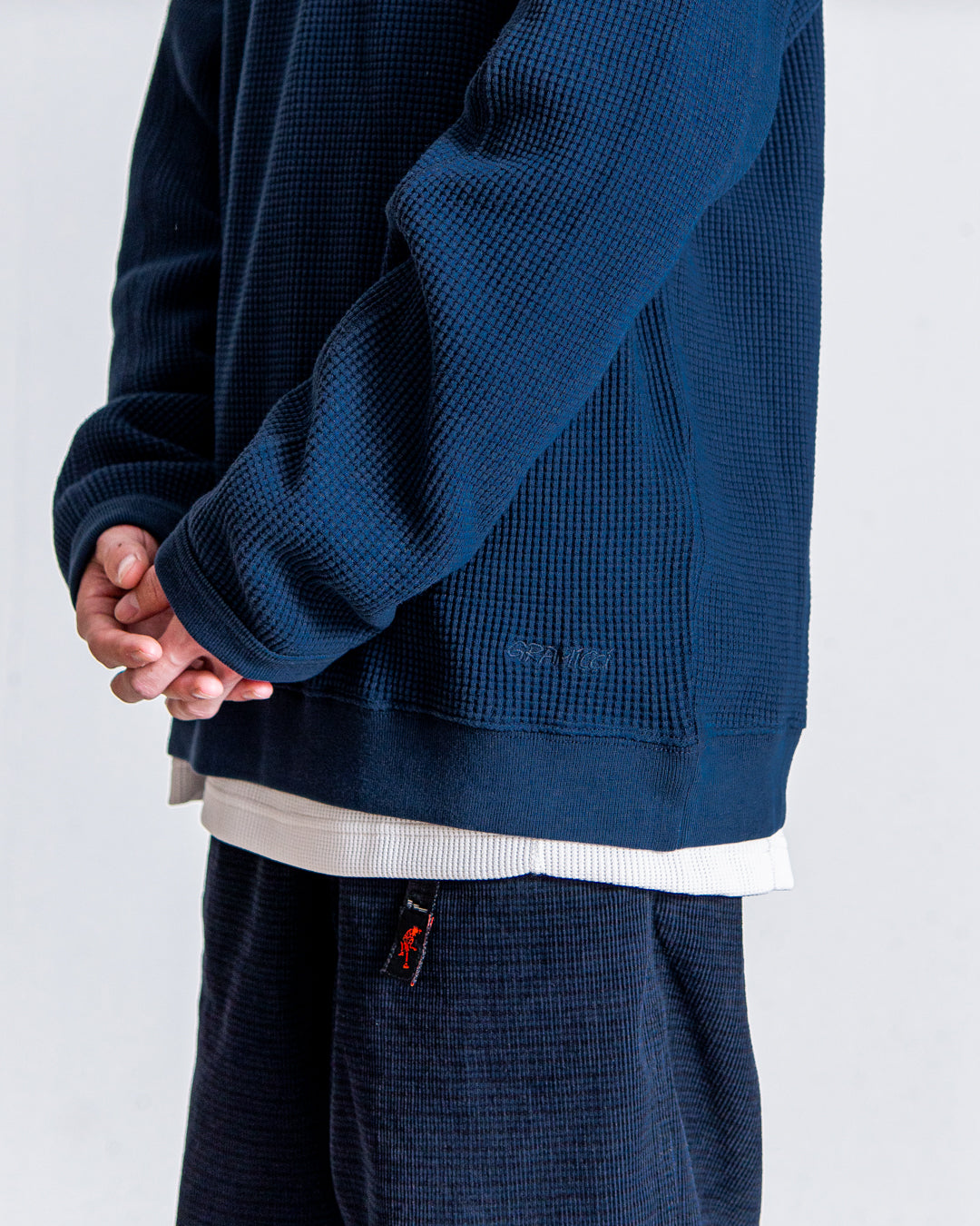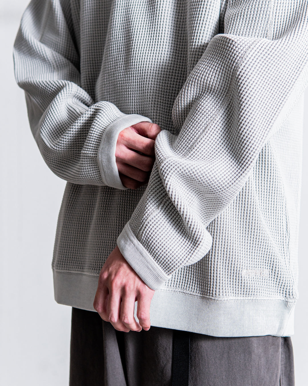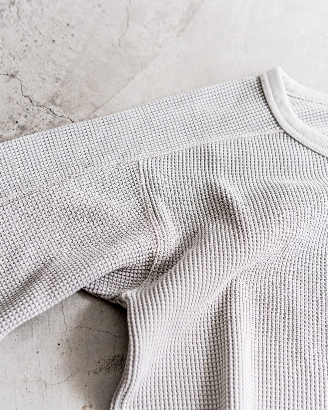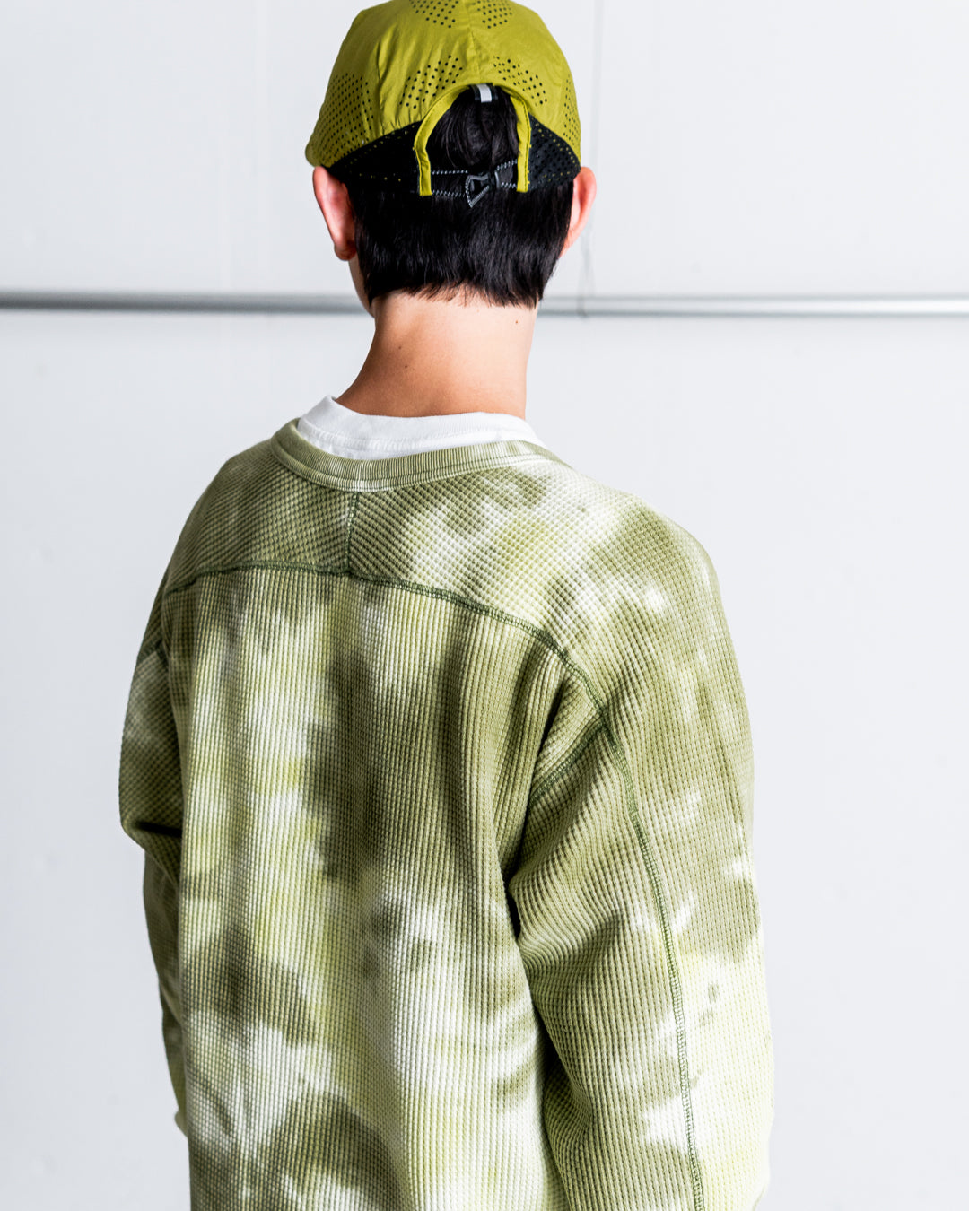 その名の通りワッフルのような凹凸のあるニットは、しっかりした厚みがありながら、とても柔軟で吸水性に優れています。袖口と裾はリブ仕様になっています。雰囲気のあるソリッドカラーとタイダイによる色展開です。