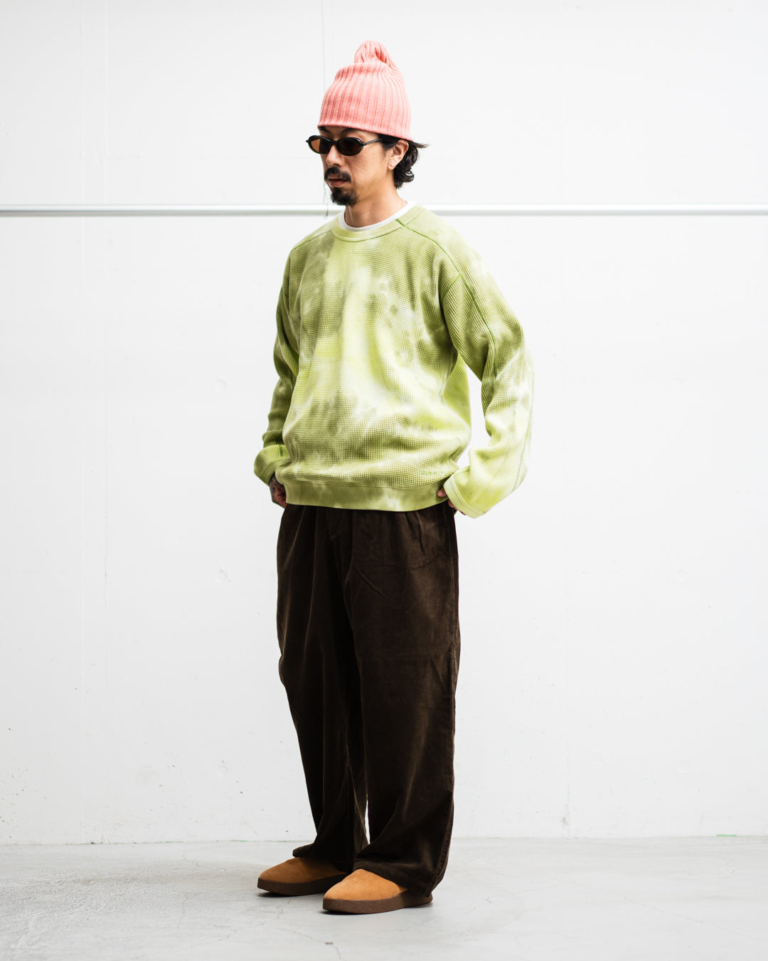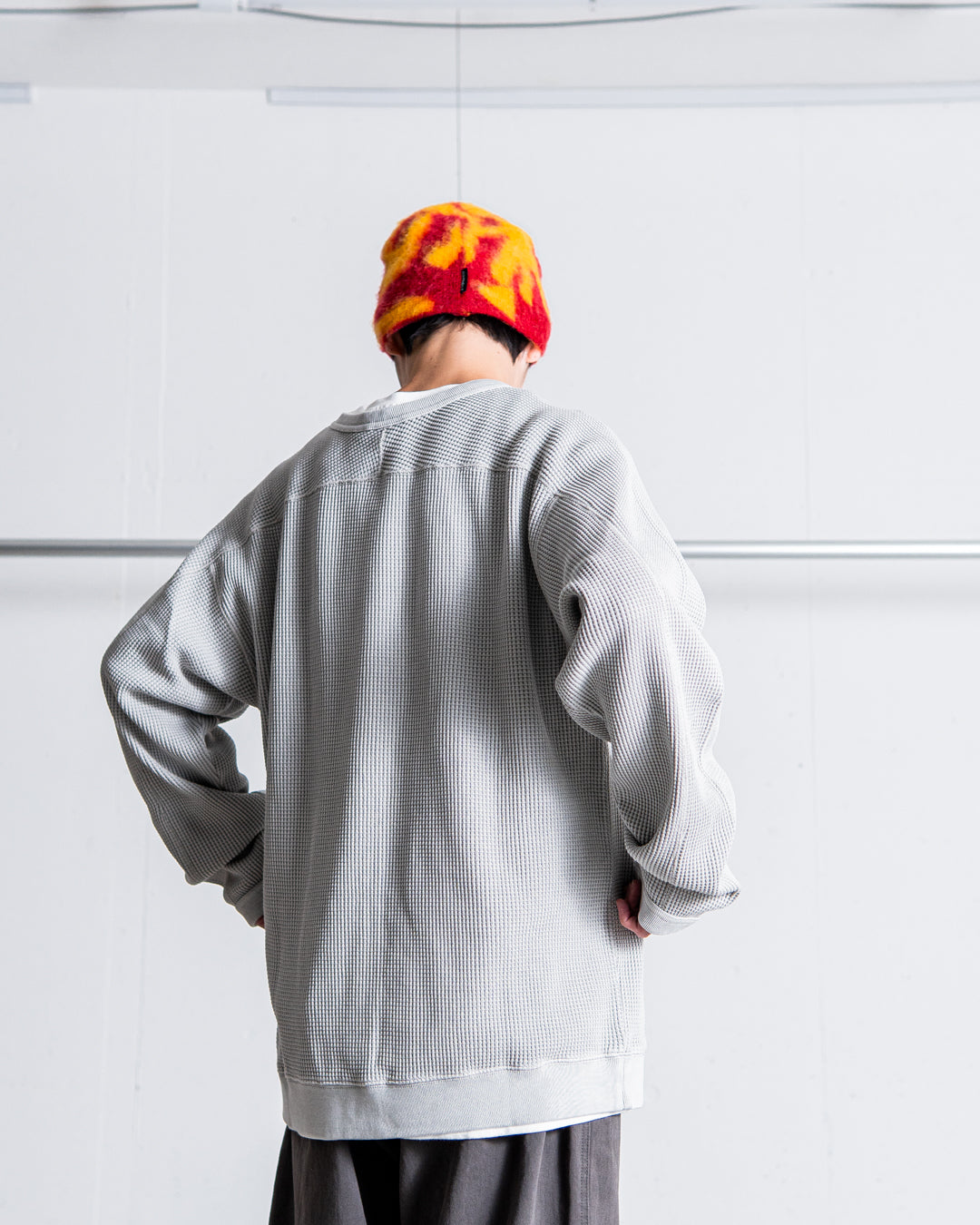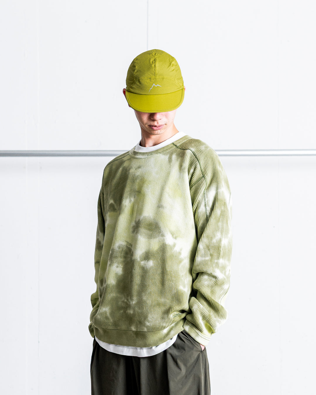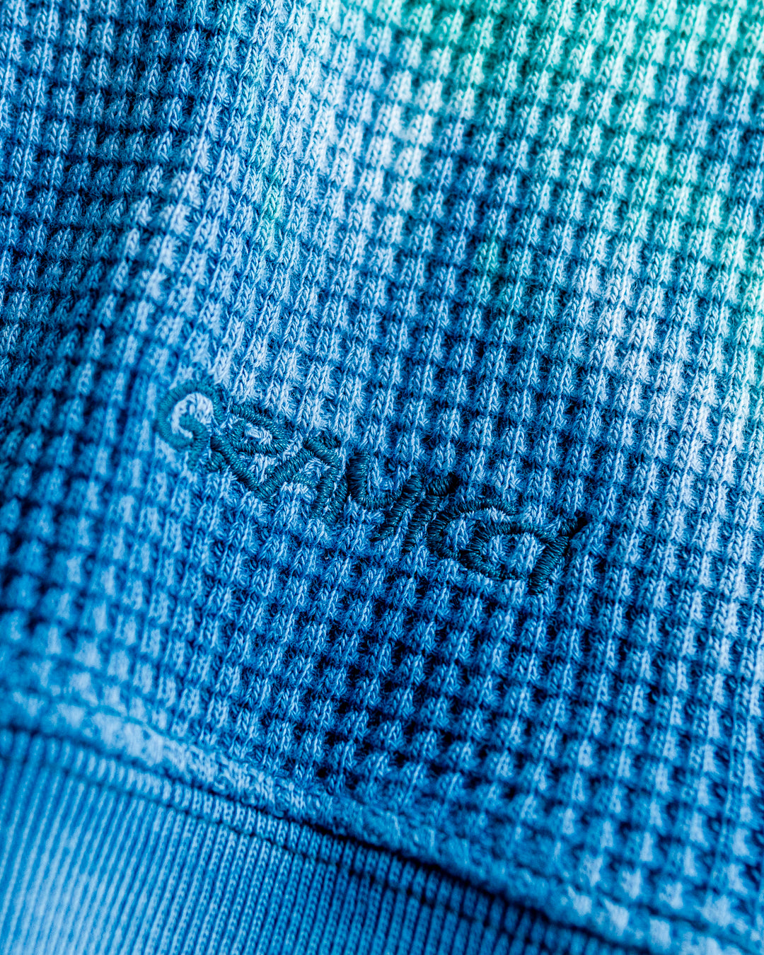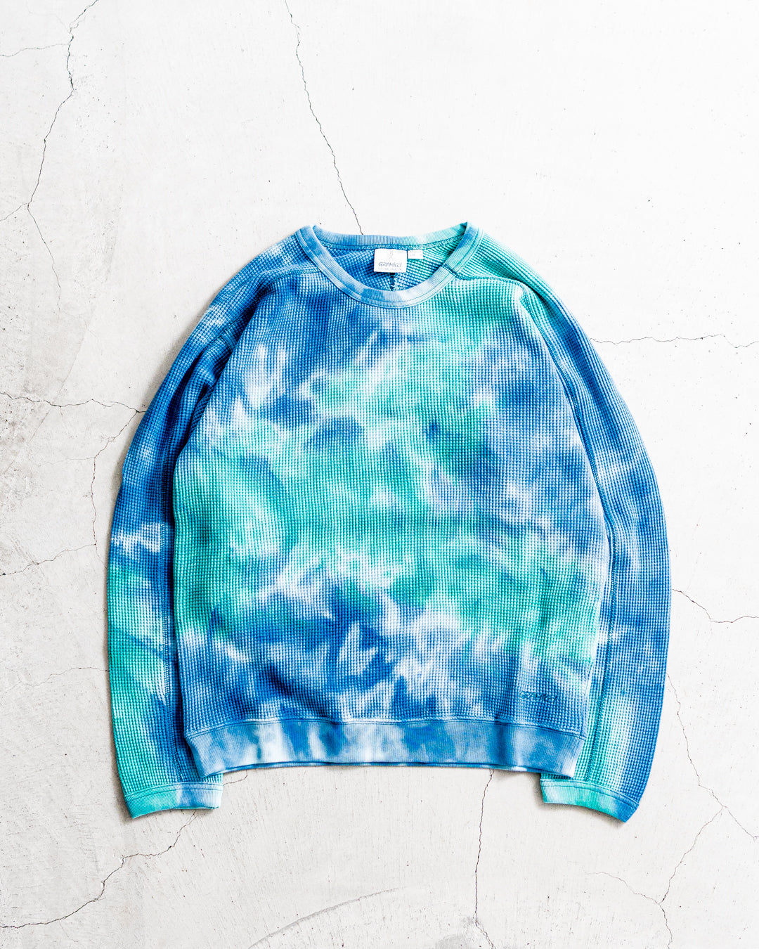 その名の通りワッフルのような凹凸のあるニットは、しっかりした厚みがありながら、とても柔軟で吸水性に優れています。袖口と裾はリブ仕様になっています。雰囲気のあるソリッドカラーとタイダイによる色展開です。
