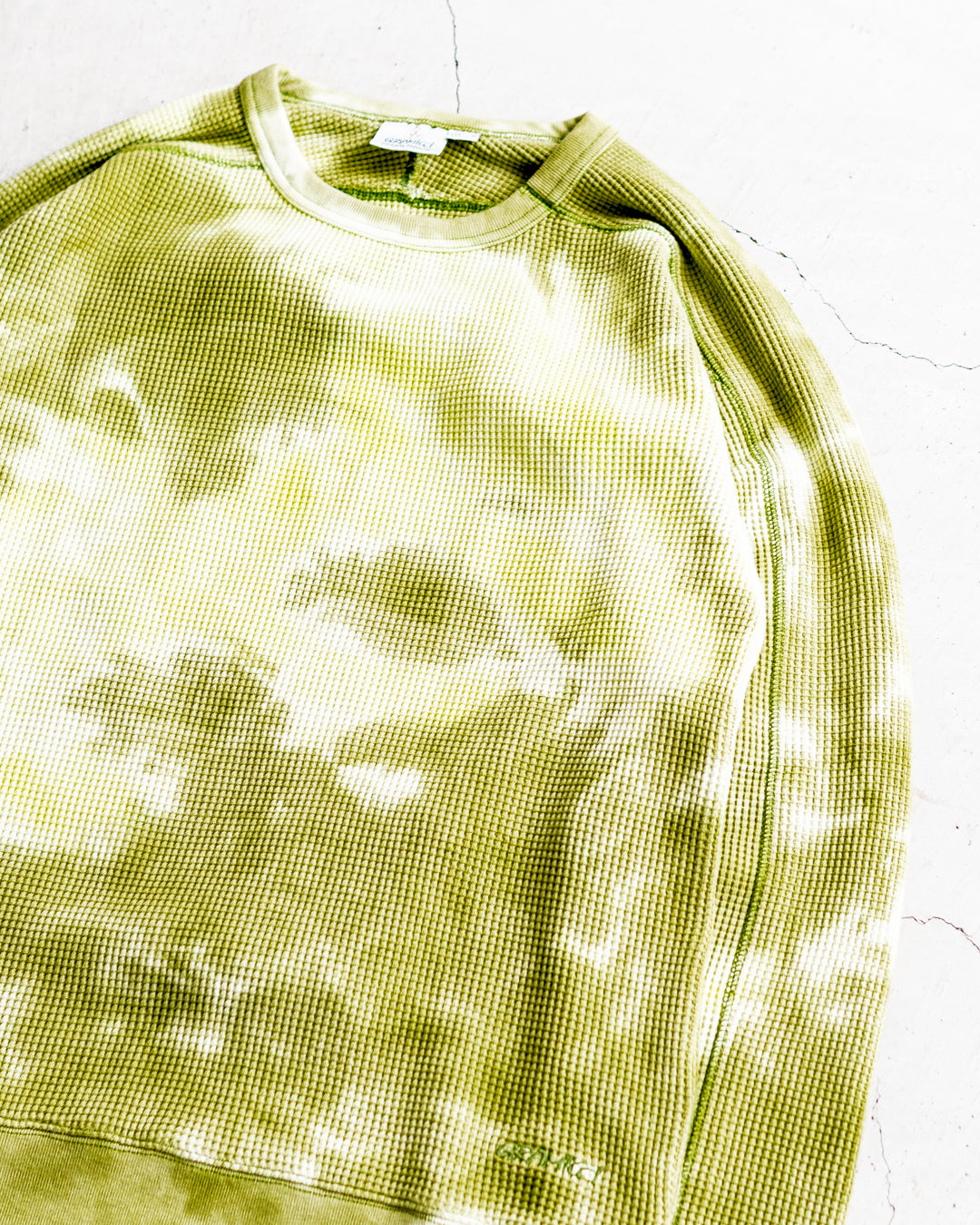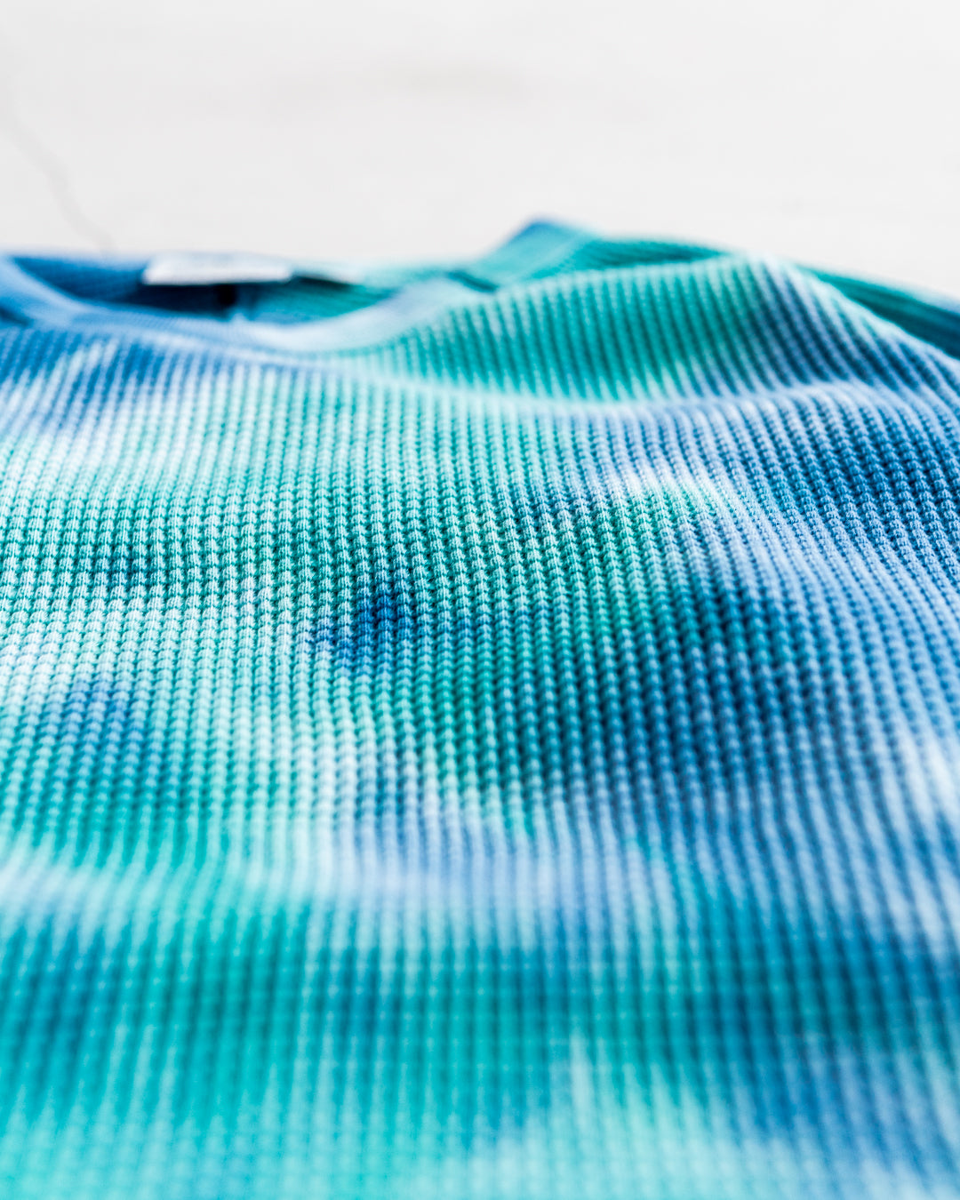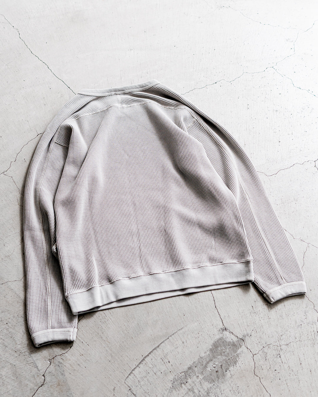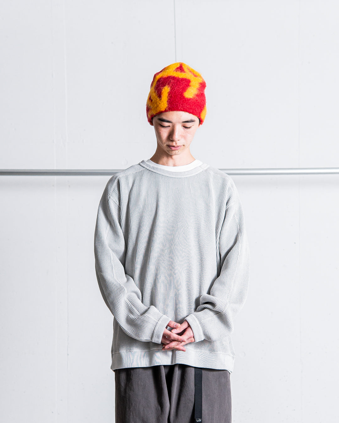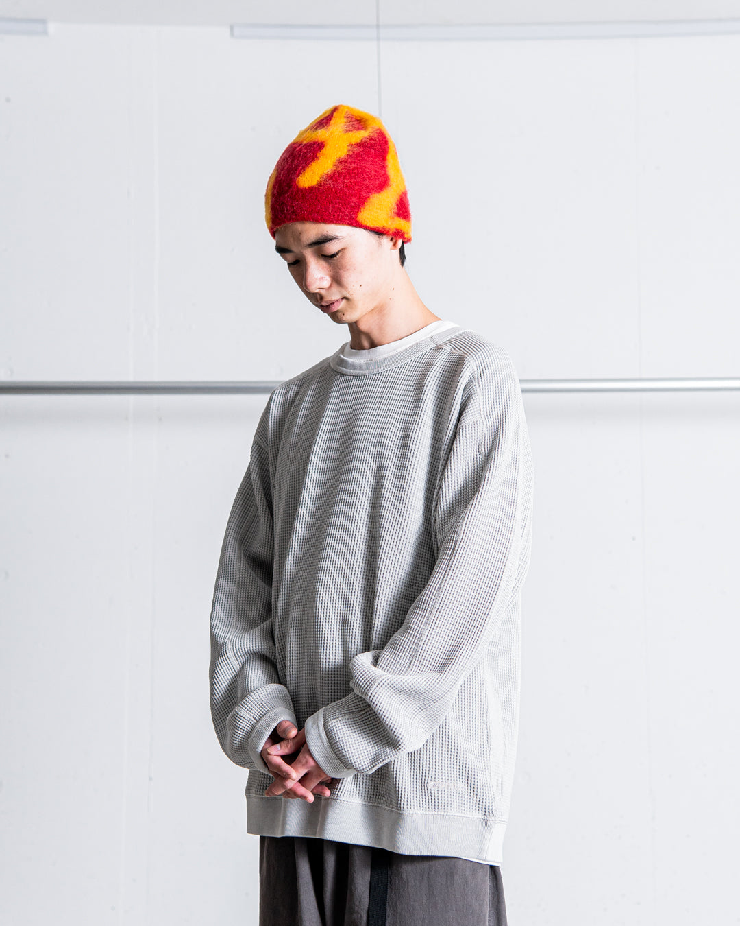 その名の通りワッフルのような凹凸のあるニットは、しっかりした厚みがありながら、とても柔軟で吸水性に優れています。袖口と裾はリブ仕様になっています。雰囲気のあるソリッドカラーとタイダイによる色展開です。