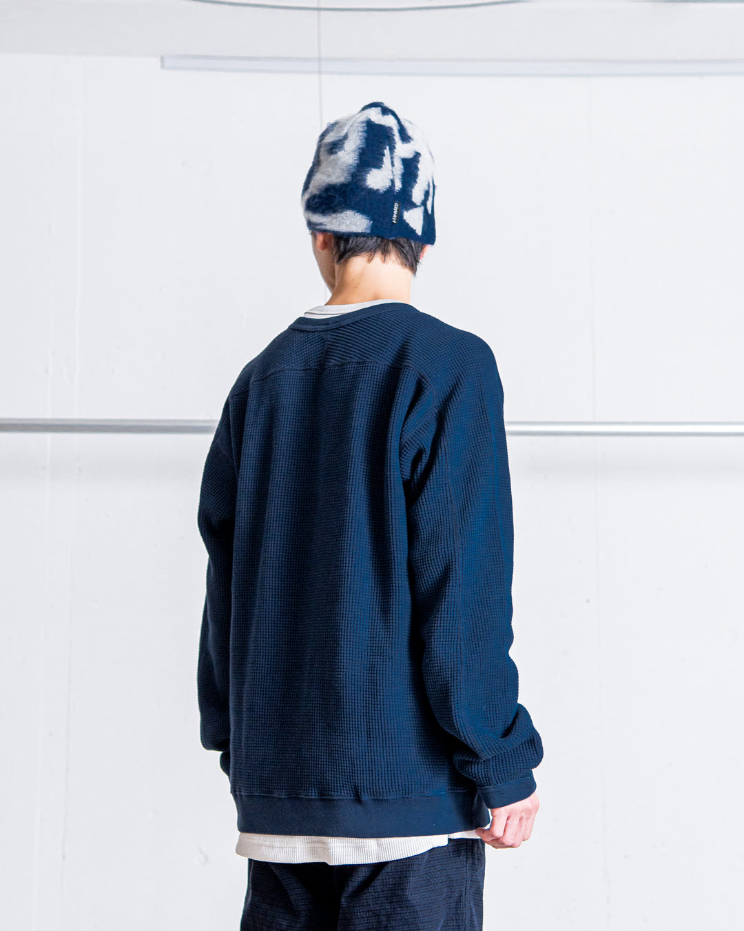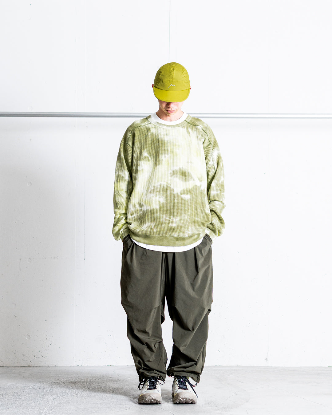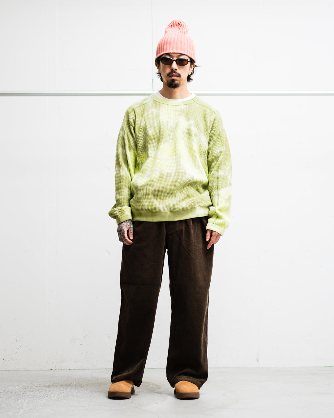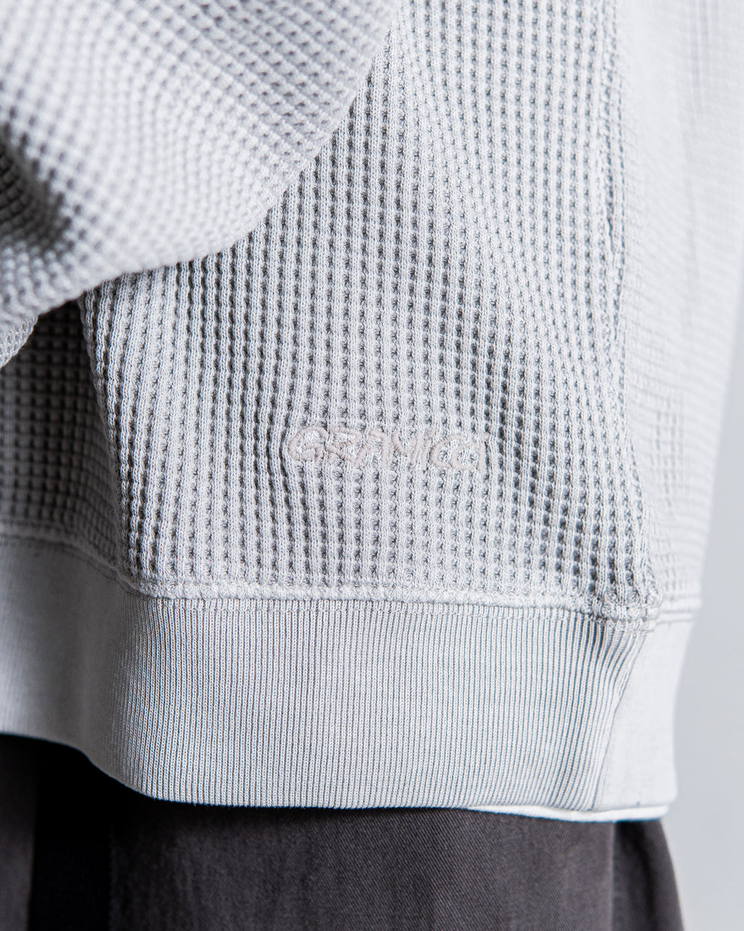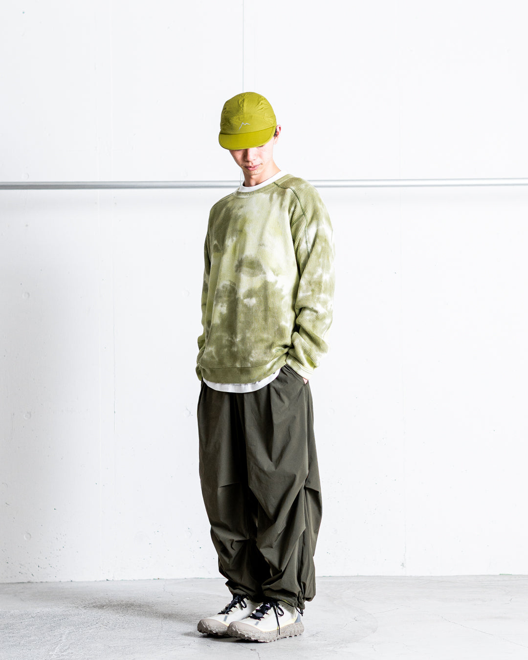 その名の通りワッフルのような凹凸のあるニットは、しっかりした厚みがありながら、とても柔軟で吸水性に優れています。袖口と裾はリブ仕様になっています。雰囲気のあるソリッドカラーとタイダイによる色展開です。