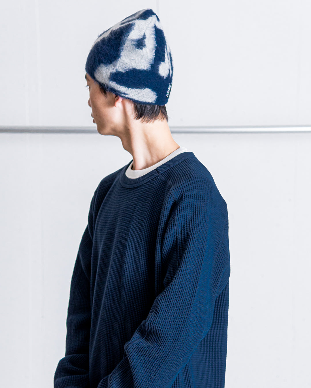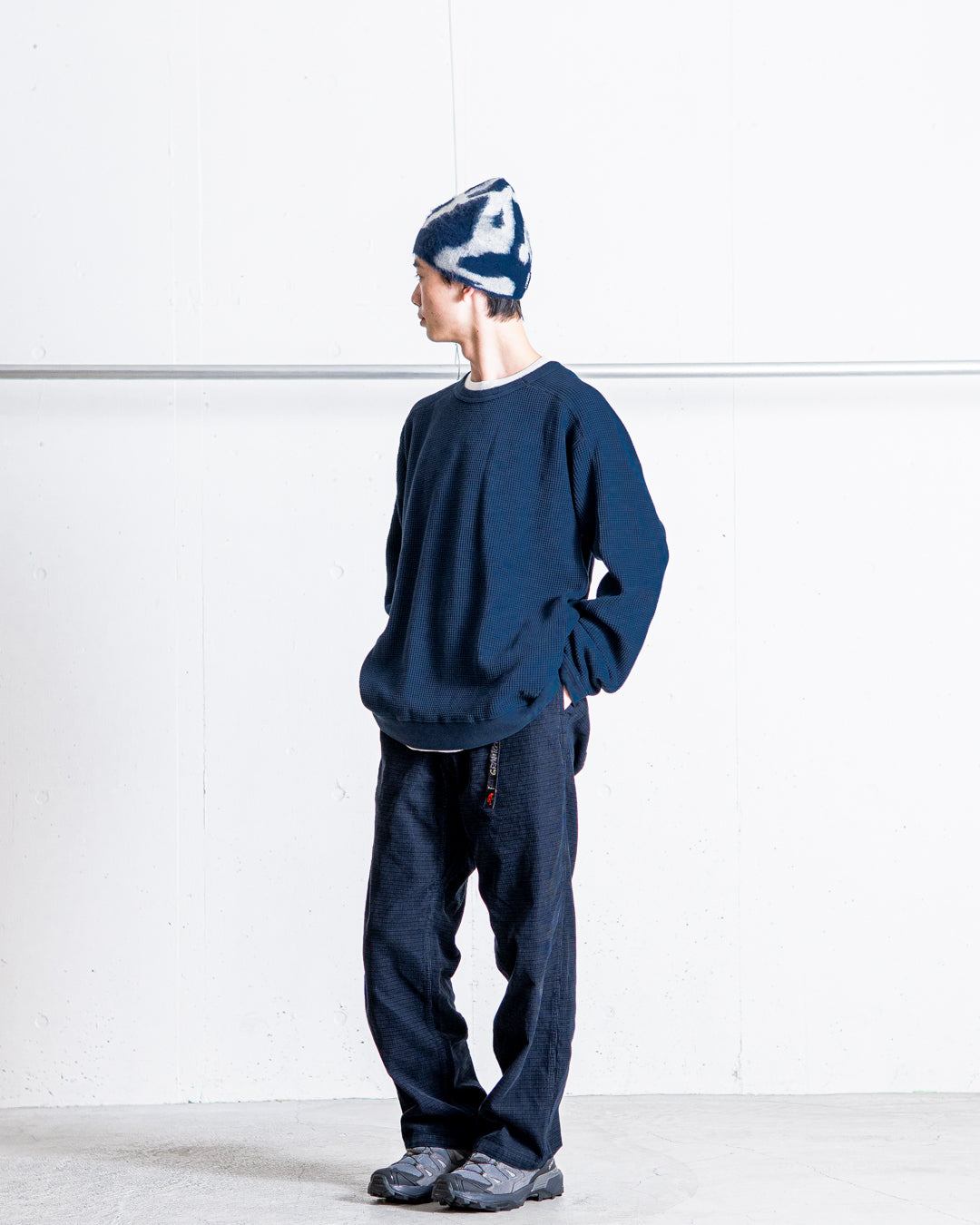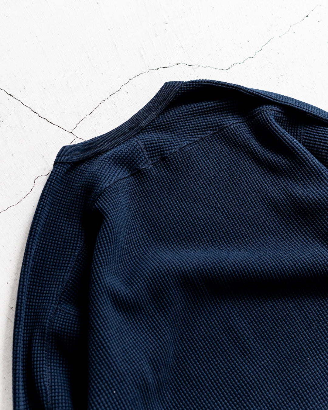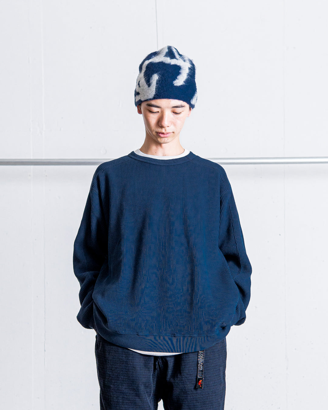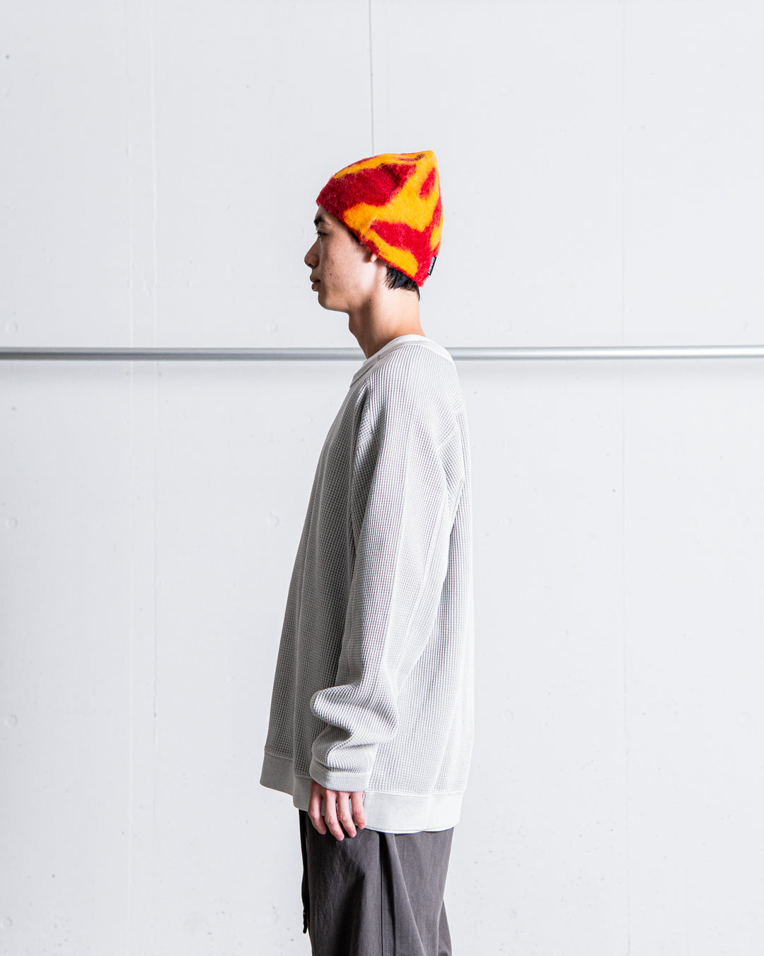 その名の通りワッフルのような凹凸のあるニットは、しっかりした厚みがありながら、とても柔軟で吸水性に優れています。袖口と裾はリブ仕様になっています。雰囲気のあるソリッドカラーとタイダイによる色展開です。