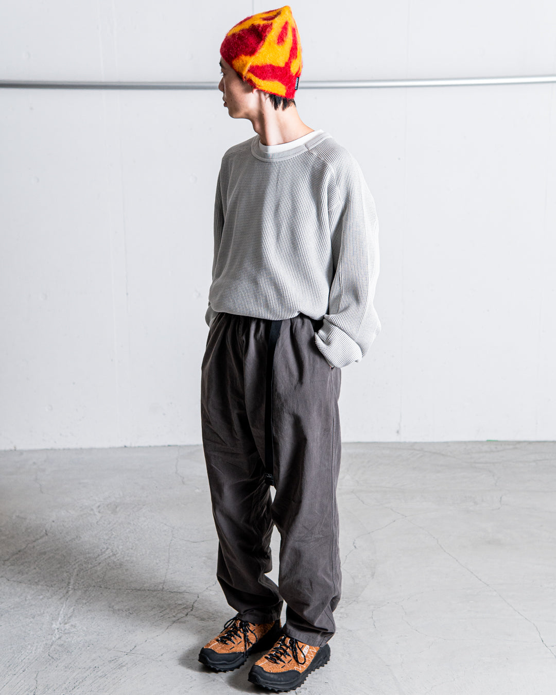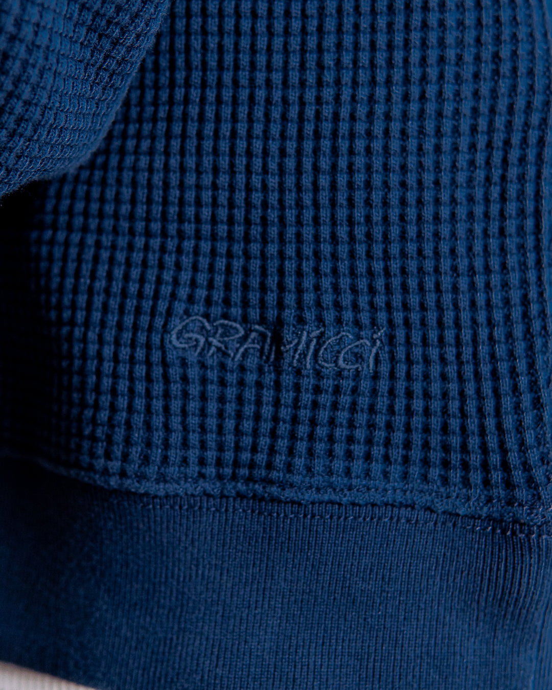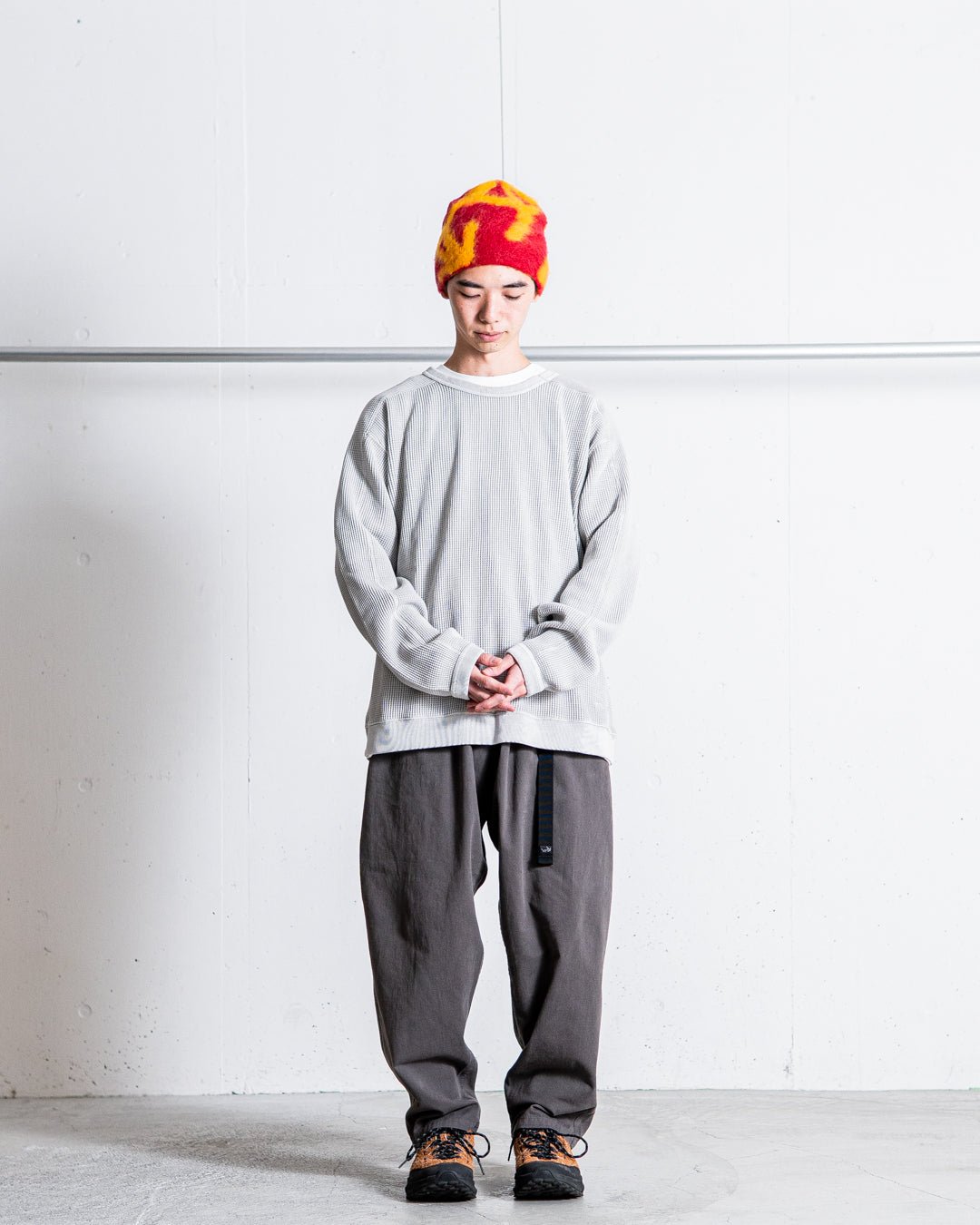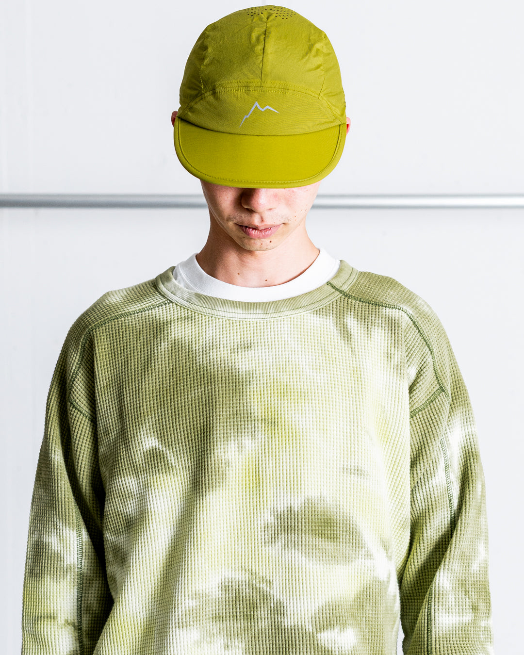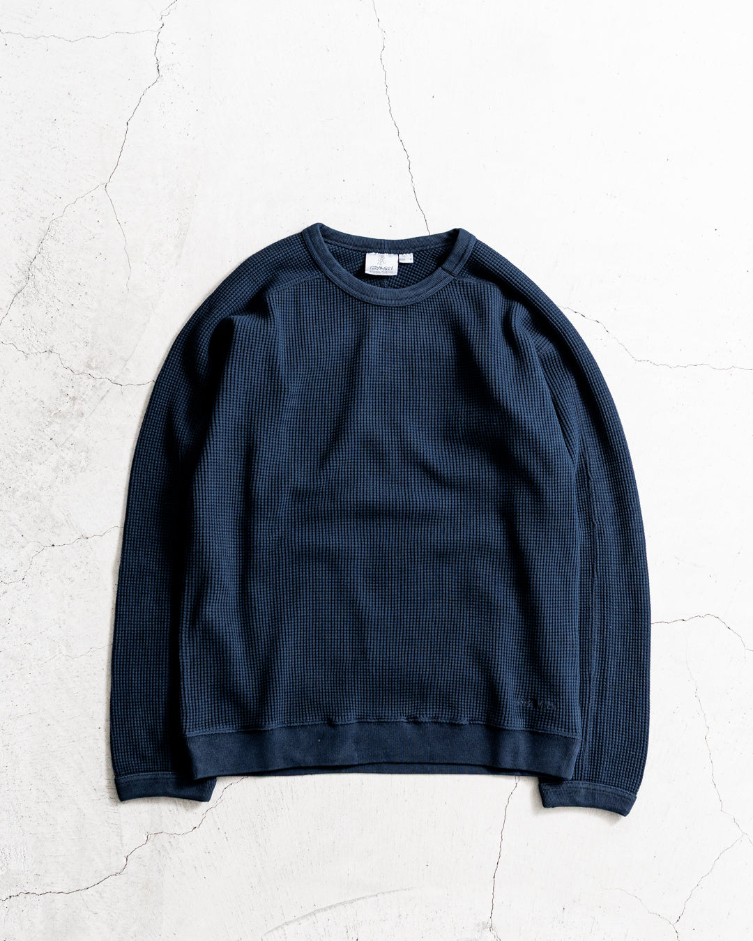 その名の通りワッフルのような凹凸のあるニットは、しっかりした厚みがありながら、とても柔軟で吸水性に優れています。袖口と裾はリブ仕様になっています。雰囲気のあるソリッドカラーとタイダイによる色展開です。