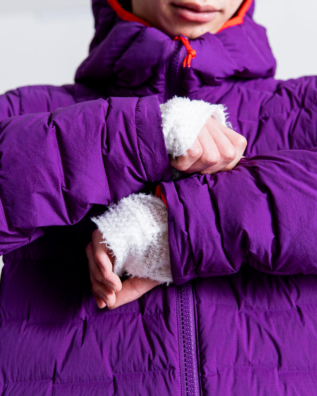 ヘルメット対応のフード部までダウンが封入されており、悪天候時も最大限の暖かさを実現します。