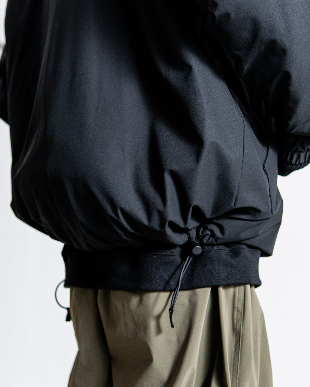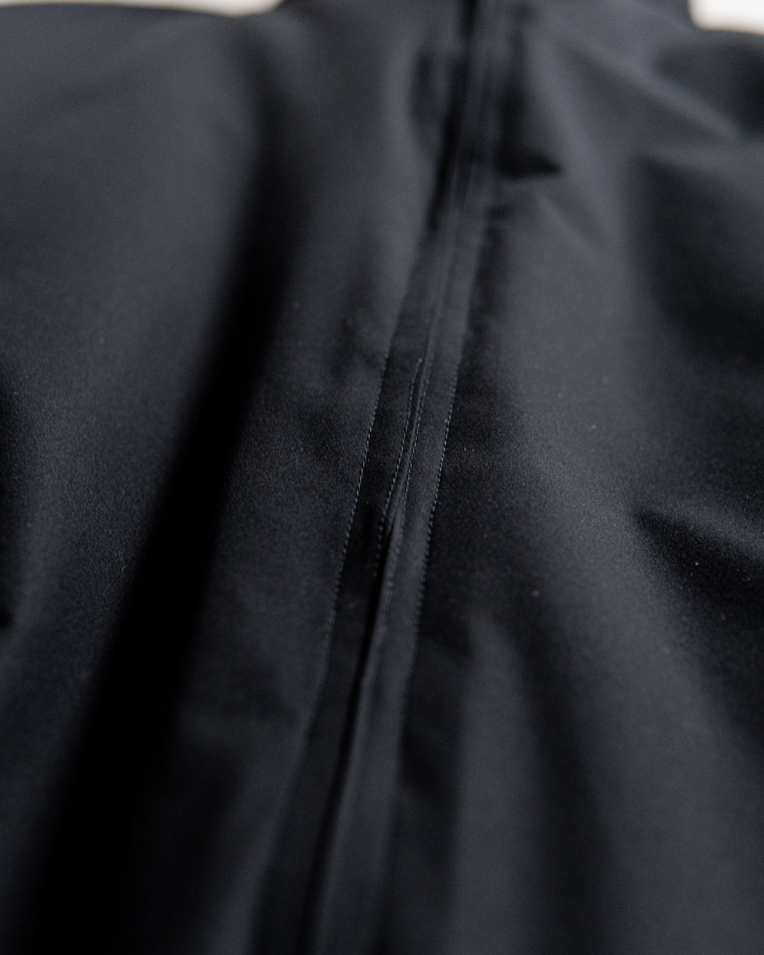防水性の高い生地と合わせて、前立てとポケットには止水ジッパーを採用しました。裾に入れたドローストリングで、シルエットの調整も可能です。