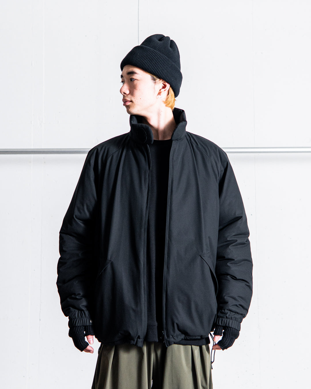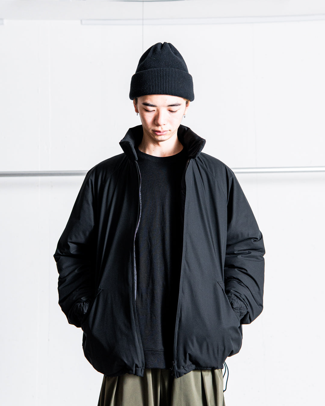 表地に日本発の機能素材「ダーミザクス」、中綿に米スリーエム社の「シンサレート」を使用した 中綿ジャケット。1980年代のアメリカでスポーツ 観戦時等に着用されていたナイロンブルゾンから インスピレーションを得つつ、装飾を省いたミニマルな表情に仕上げました。