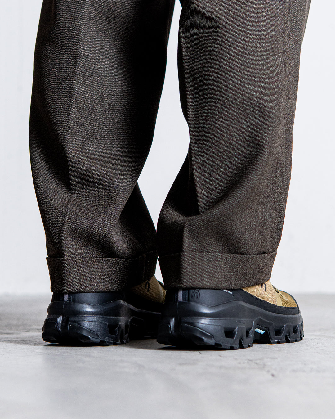 片側をアウトタック、もう片側をインタックにすることで、すっきりとしたシルエットを生み出している。ウエストは緩すぎない適度なボリュームで、ダブルタックのパンツは裾に向かって緩やかにテーパードしたデザイン。