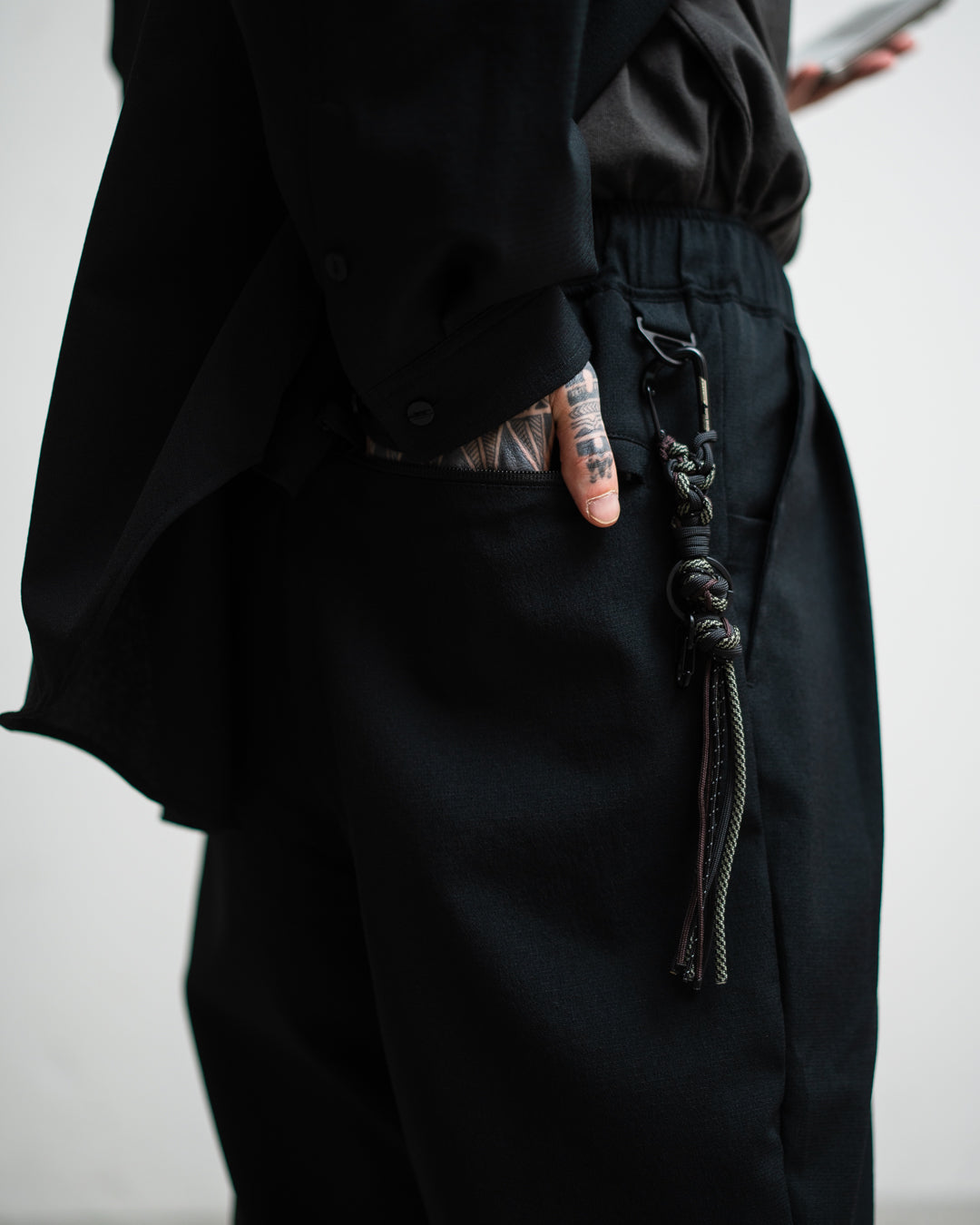 特殊技術により製造された通気孔のある多機能ポリエステル素材を使用したワイドパンツ。ワイドで縦に落ちる綺麗なシルエットが特徴。