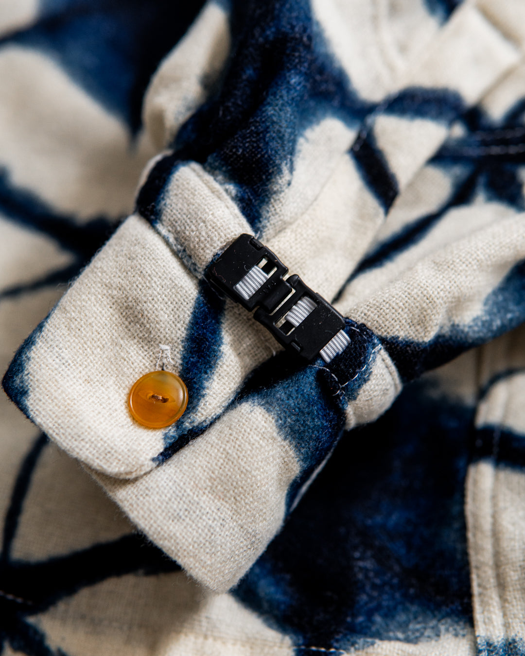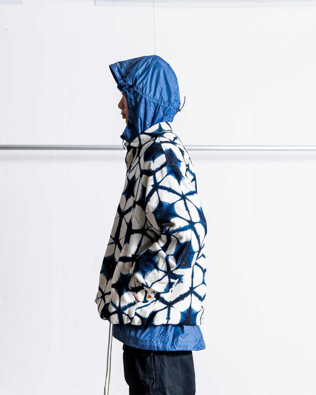 ゆったりとしたシルエットのファーマーズシャツと伝統的な和染プリントでリミックスイメージを表現。保温性、強度にも優れた実用的な機能アイテムです。