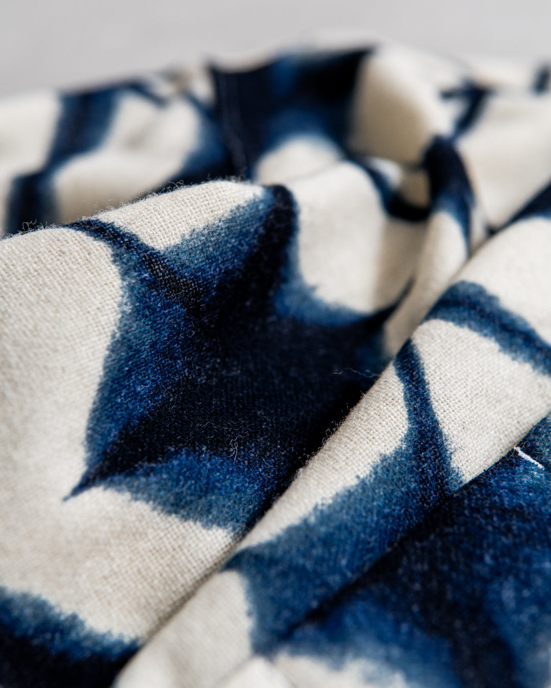 ウールナイロンをベースとした和風ムラ染プリントのプルオーバーシャツ。