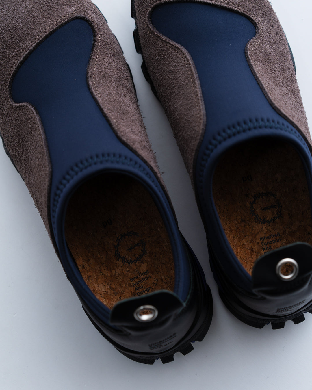 ライト・トレッキング用のvibram®ソールを搭載した、新しいモックタイプのシューズTRAIL MOCです。たくさんの方に愛されたGARDEN MOCの後継モデルになります。前作よりシャープでよりアクティブなシーンで活躍する1足です。アッパーは表面に毛羽立ちがあるシャギースエード(牛革)と伸縮性のあるネオプレーン、ヒールにスムースレザー(牛革)の3素材で構成しています。我々は古今東西、様々なスニーカーに触れています。調節器具がつかないスリッポンのモックシューズは、いつでも魅力を感じます。街でも自然の中でもフィットする、今履きたい新しいモックシューズ、TRAIL MOCの登場です。