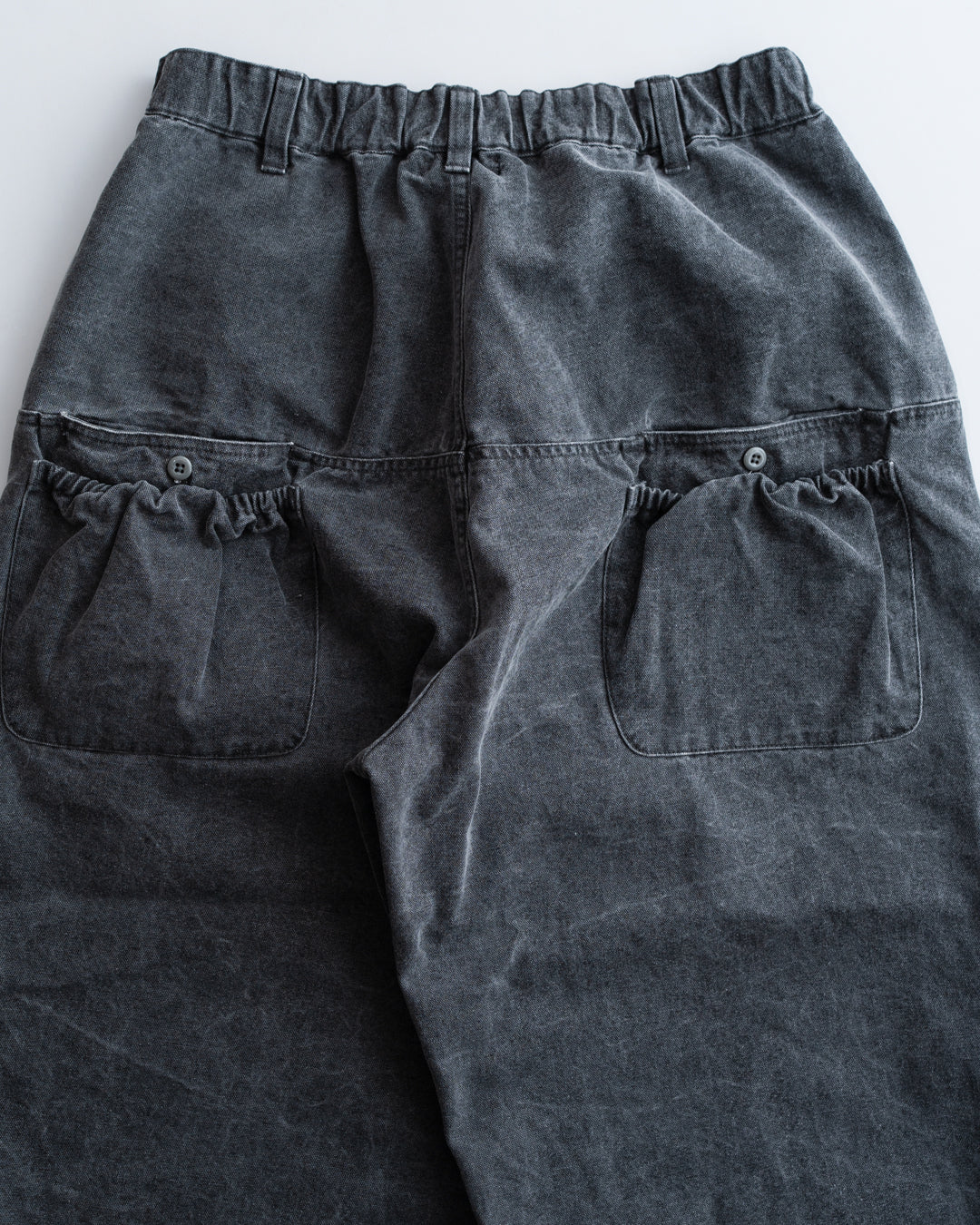 超超ワイドや、5超など職人たちの中ではパンツの太さでキャラクター性を表現していたことから 極太のシルエットと腰穿き(ローライズ)を思わせるディテールを再構築し、制作しました。 素材は顔料加工を施したオックス素材。 顔料を退色させる為にバイオウォッシュを施しています。 ・4つの構造のバックポケットが特徴的。