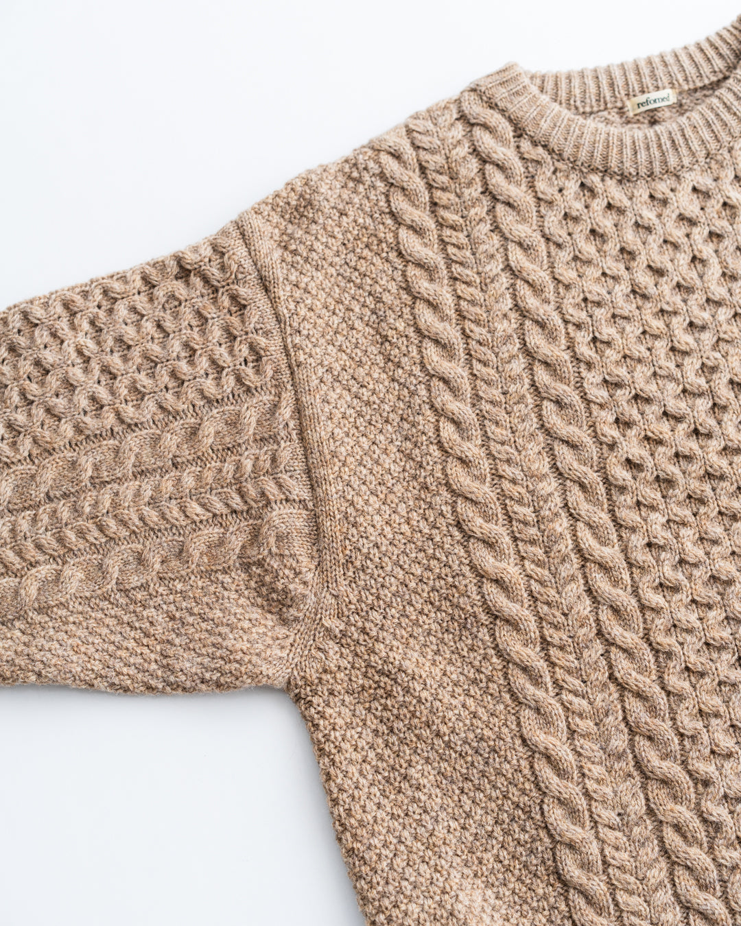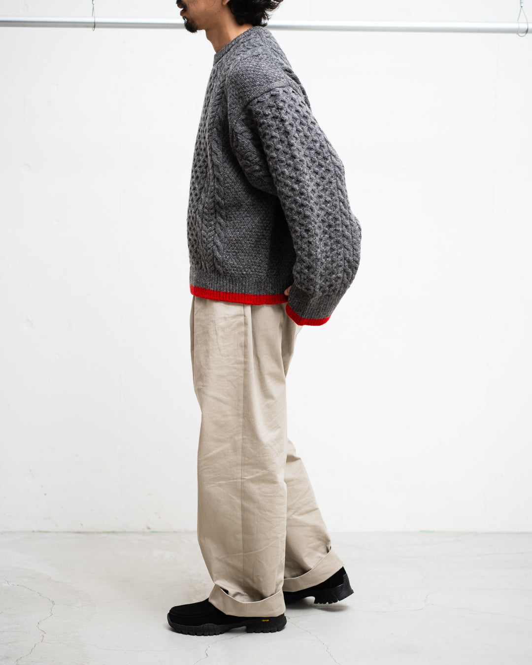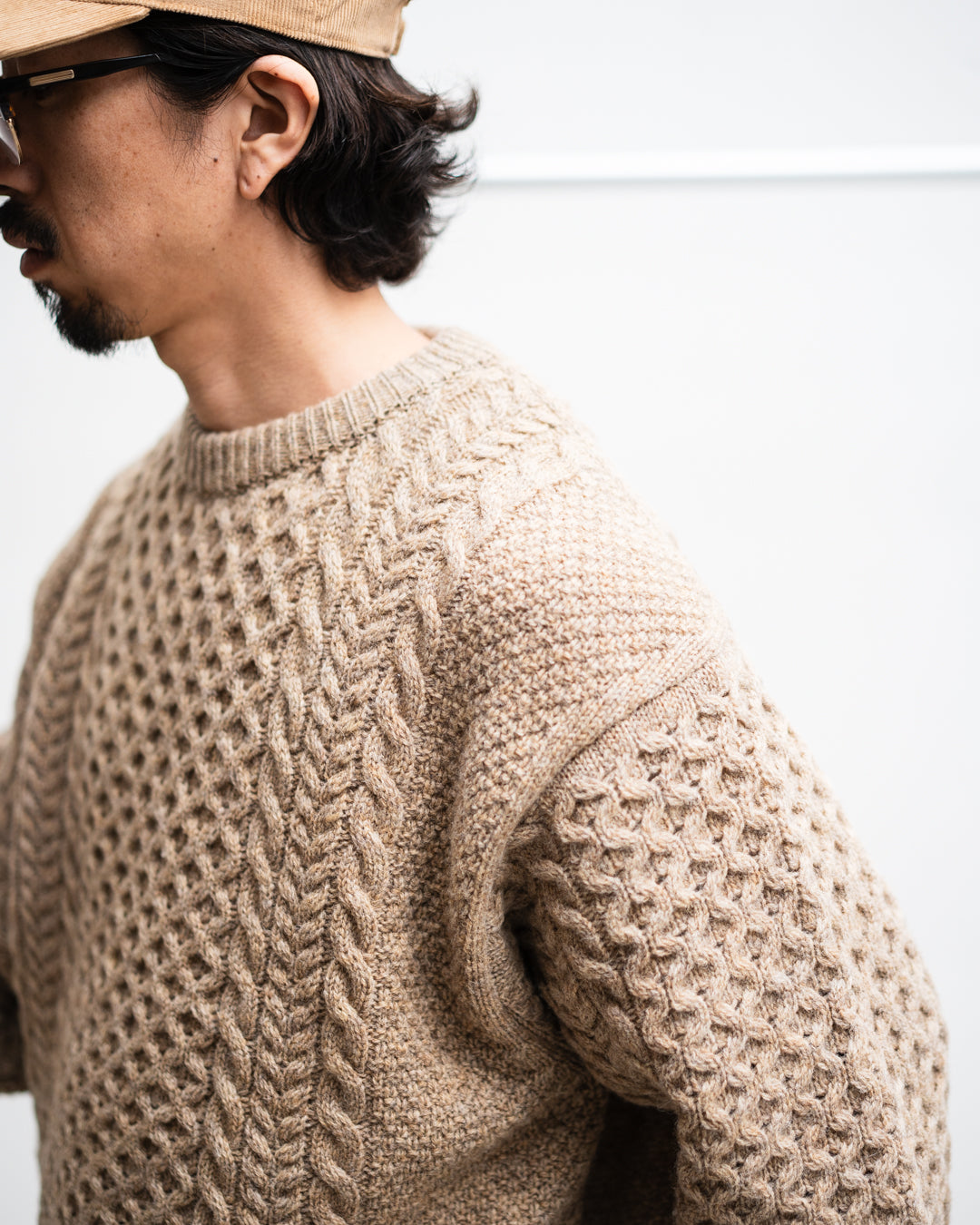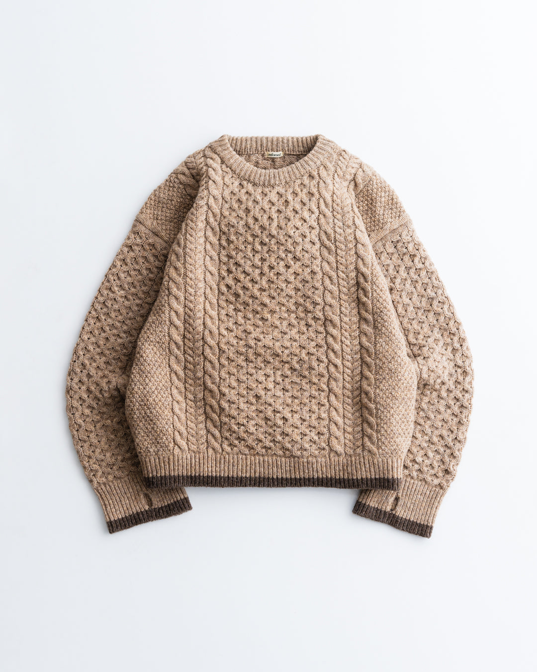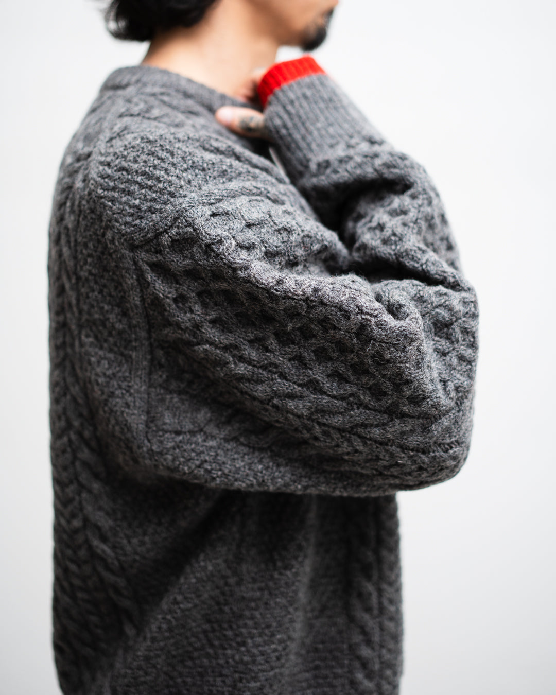 作業現場において欠かせない存在である"軍手"をイメージしたプルオーバーニット。 作業環境によっては、安全上の理由から目立つ色を選ぶことが必要な場合があり、汚れが目立ちにくい色や、日焼けしにくい色を選ぶこともあります。 企業や組織の規定に従って特定の色を選ぶ場合もあり、職人の軍手の色の選び方は様々で面白いです。 糸はハリのあるドライな風合いのウール糸を使用しています。 ハリのある素材がケーブル編みを際立たせています。