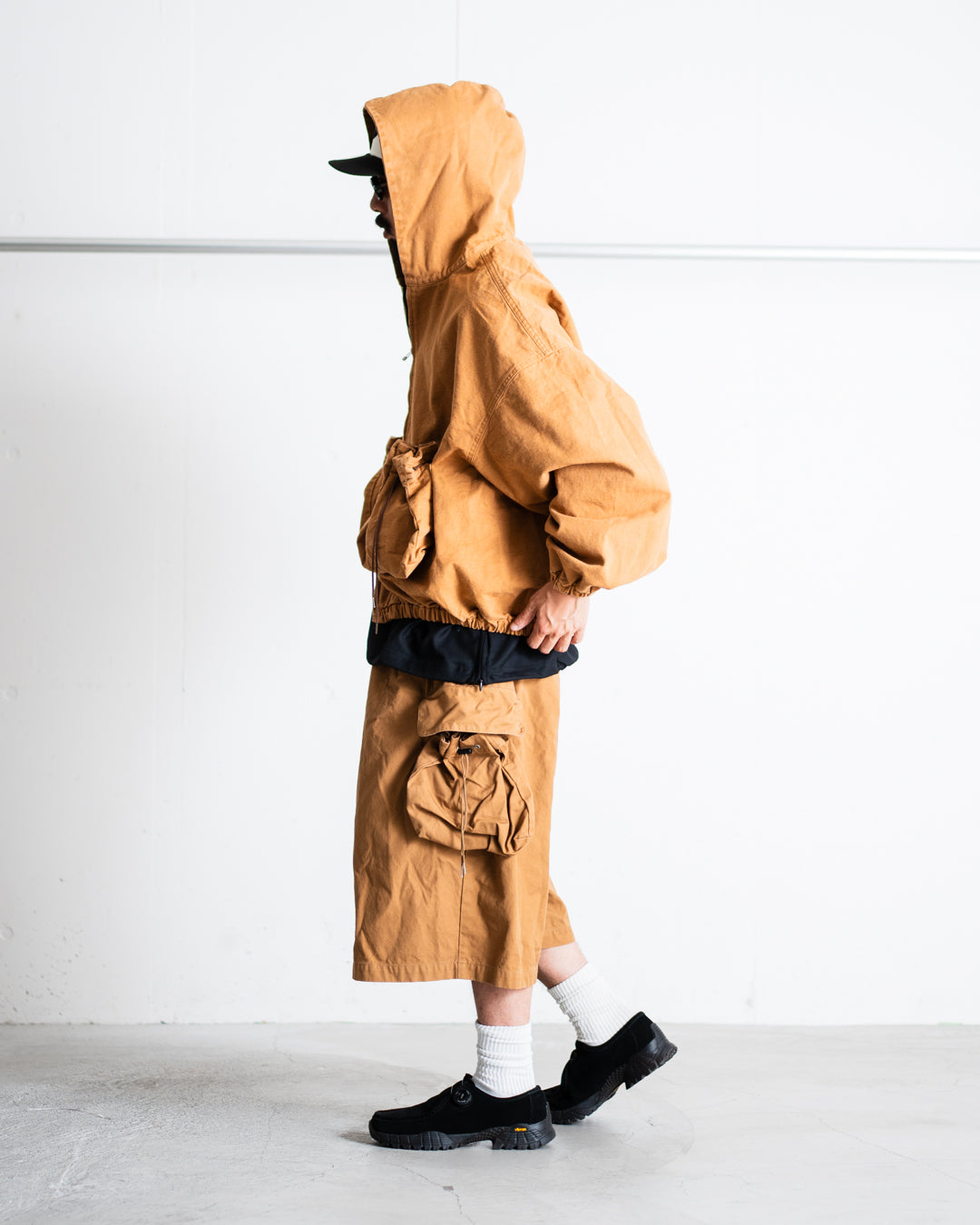 下着のトランクスから発想を得た8分丈パンツ。 トランクスイメージの前身頃のボタン、 左官に使用するコテ袋をイメージした脇ポケットが特徴です。