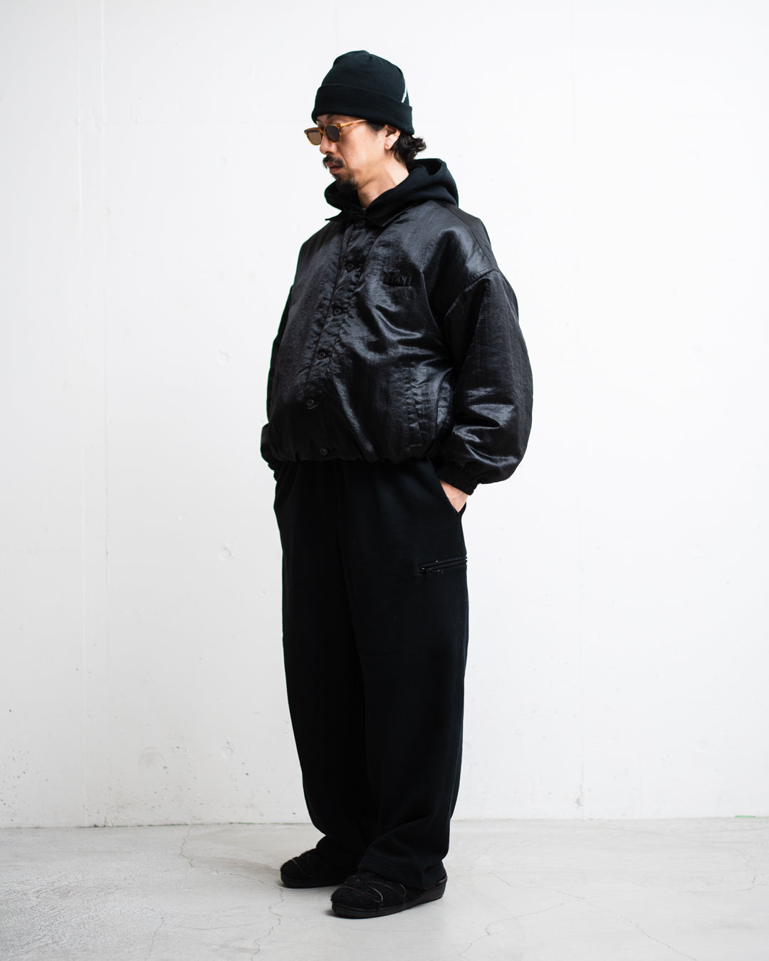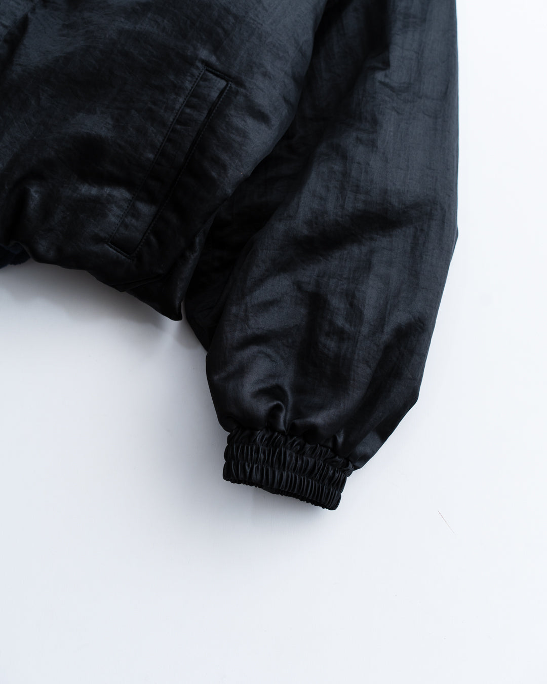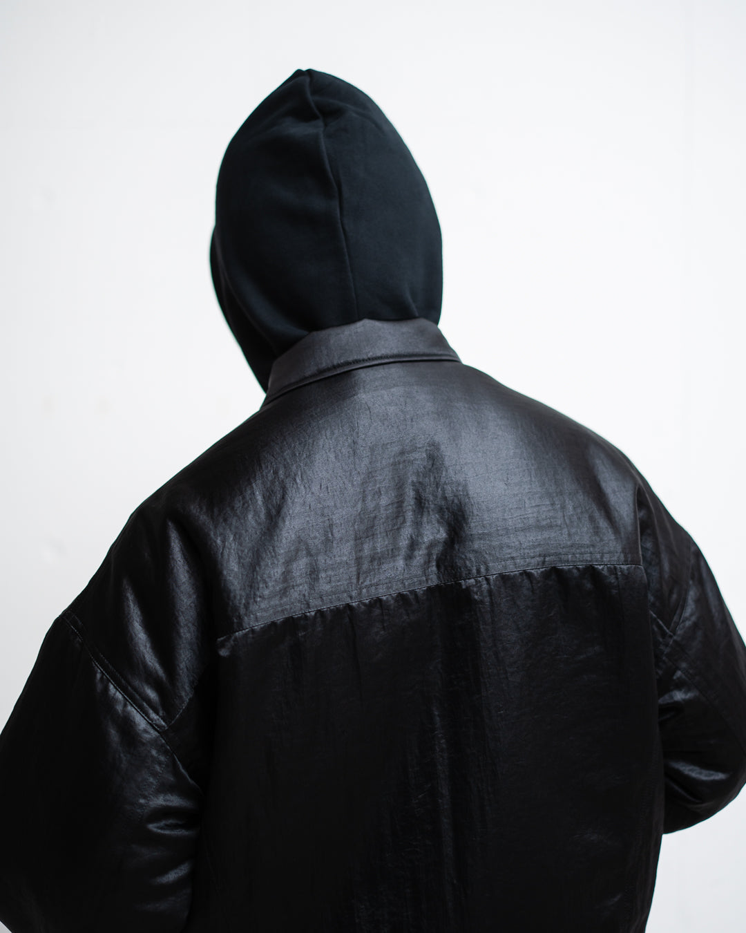 歴史的ワークウェアから各ディテールを取り除いた一着。 ナイロンサテンにコーティングを施し、タンブラー加工によってヴィンテージ感のある光沢を表現。左胸には、refomedの象徴ともいえるゴムディテールで表現したタグを配し、アイコニックなアクセントを加えている。