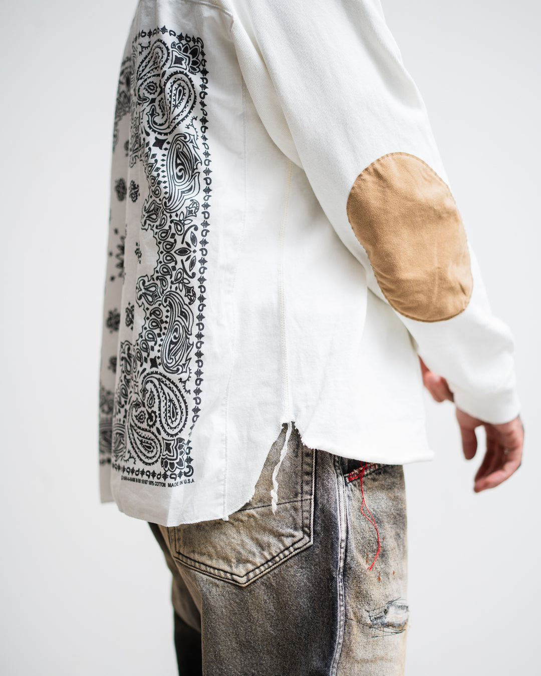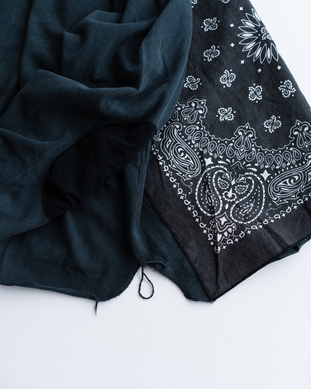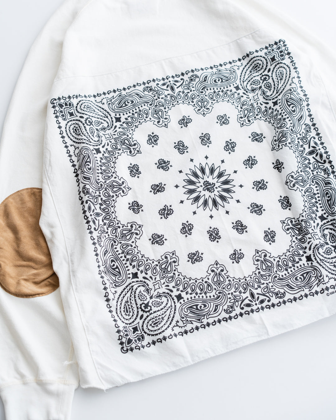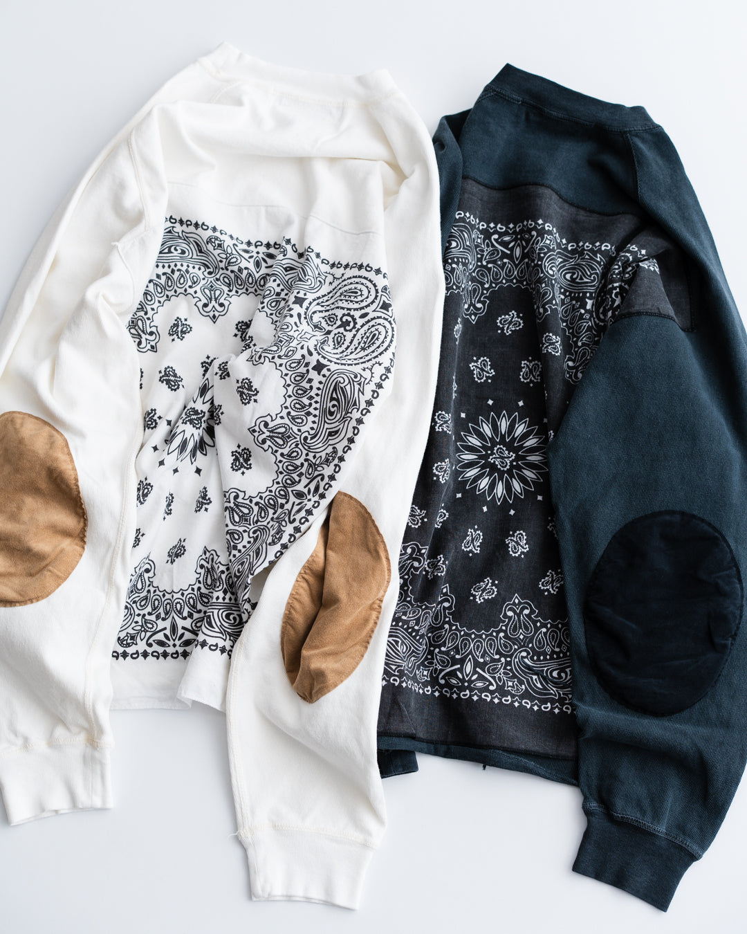 背面にはヴィンテージバンダナを貼り付けており肘には異素材のエルボーパッチも施しております。