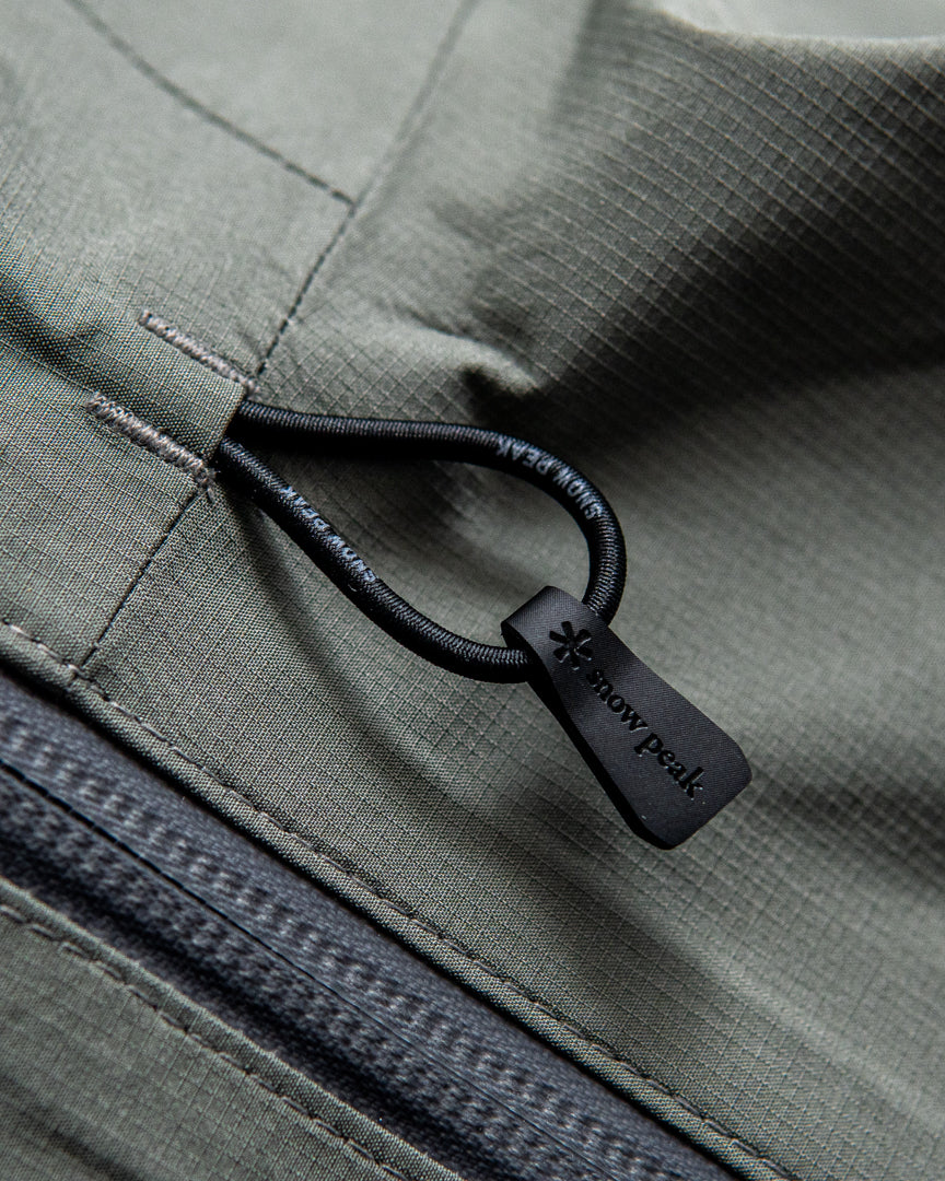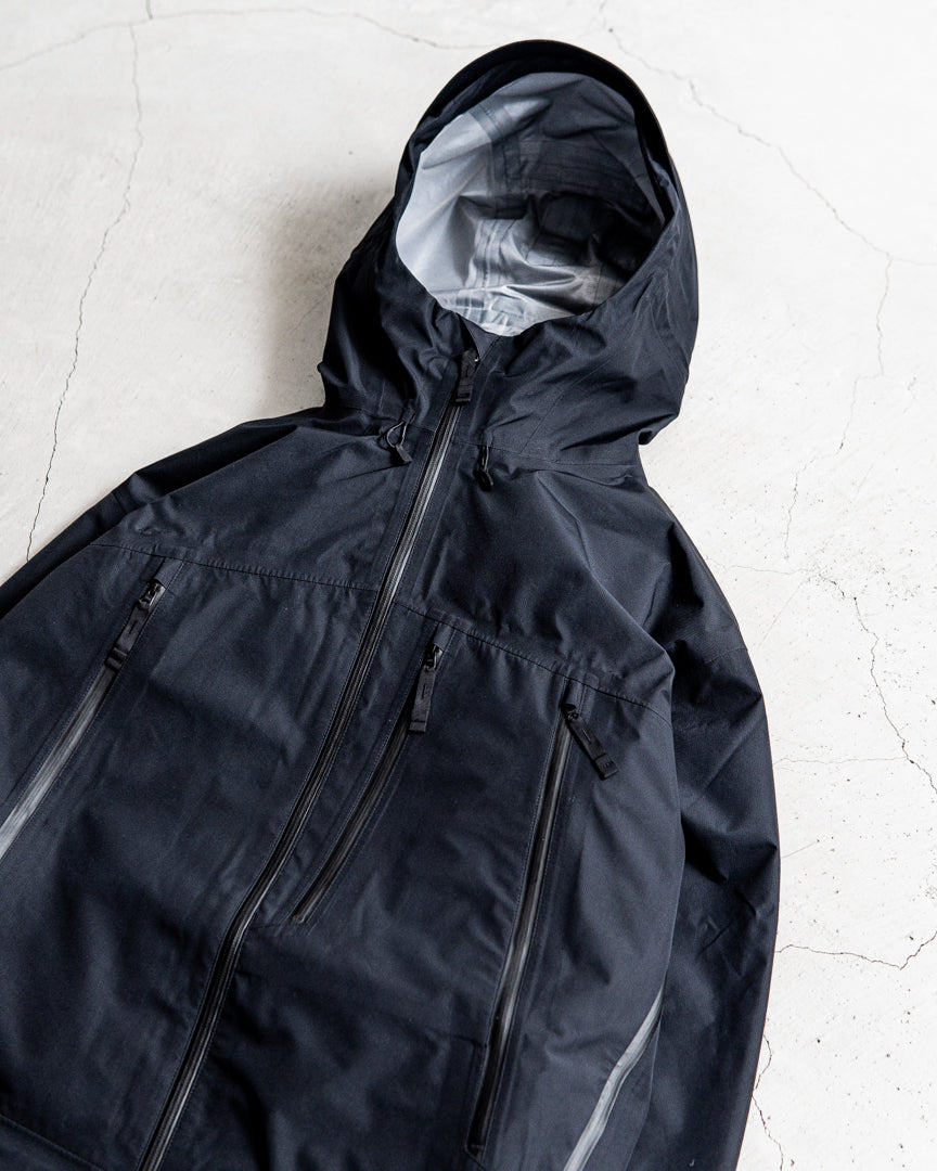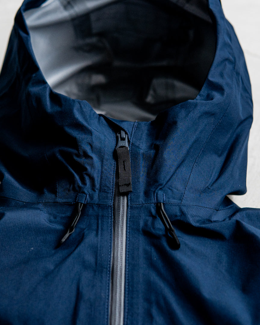こちらは完全防水のフルシーム加工となるレインジャケット。脇には止水ファスナーのベンチレーションを配置し、フロントのダブルスライダーファスナーと併せて、衣服内の温度調整が手軽に行えるようにしました。袖上げのしやすさや、使いやすいポケット位置など、随所にこだわりの詰まった一着です。着丈も長めでヒップまでカバーが可能です。一見シンプルに見えるフード部分にも、調整タブやハンギングループなど、気遣いのディテールがあしらわれています。