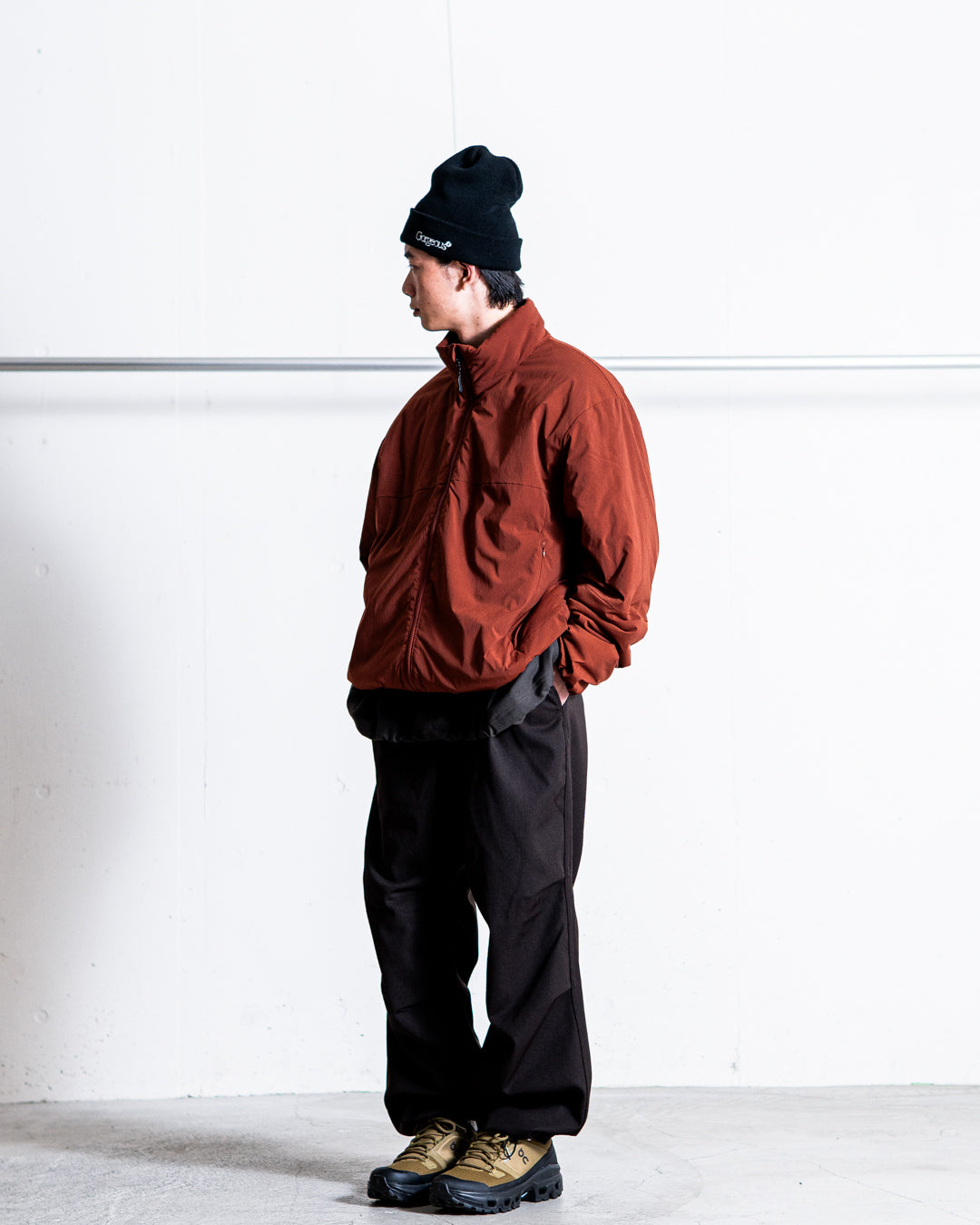 インナーに着込んでも窮屈さを感じにくいゆったりとしたシルエットで、袖口はゴムシャーリング仕様で冷気を防ぎ、裾はアジャスターでシルエットの調整が可能です。