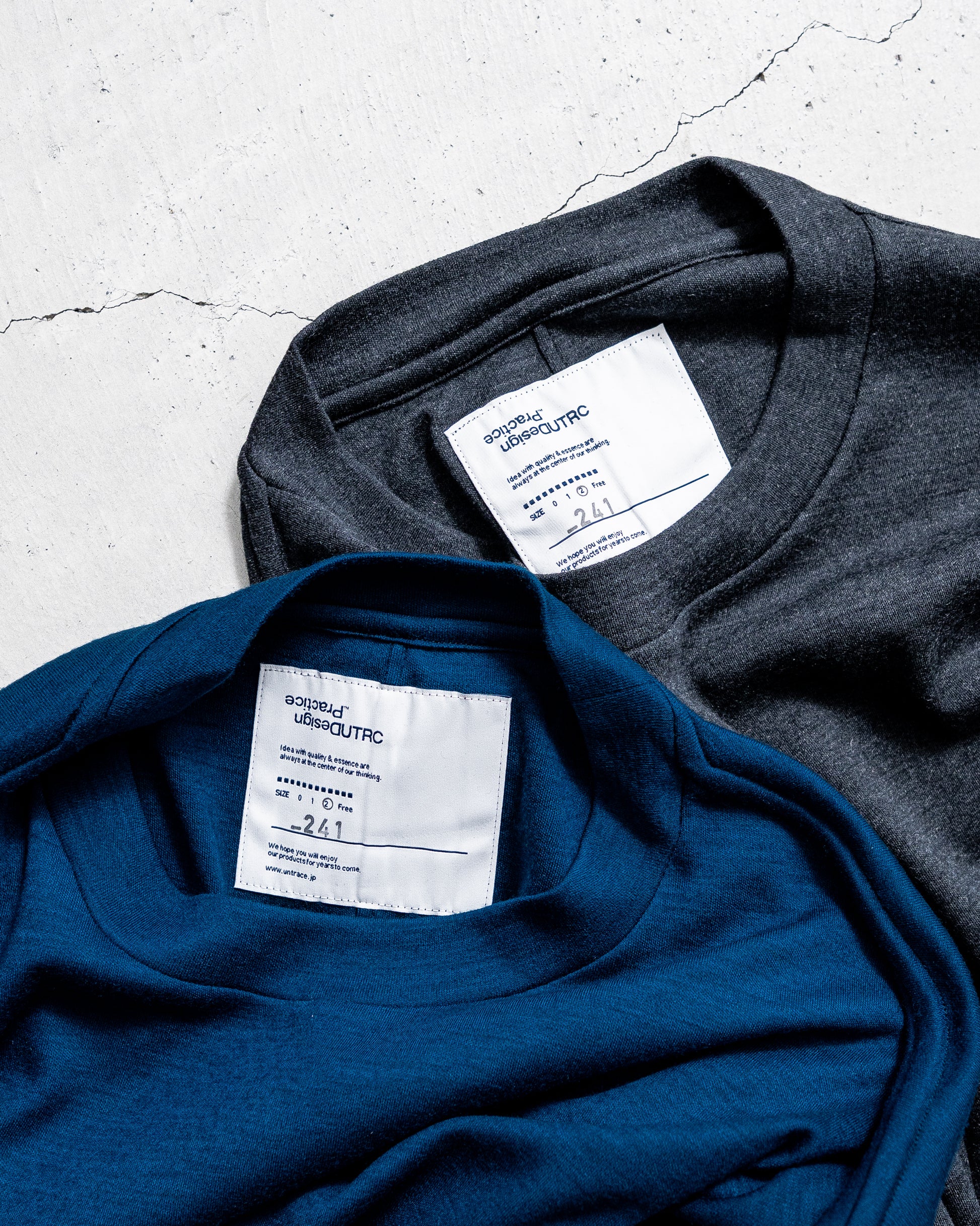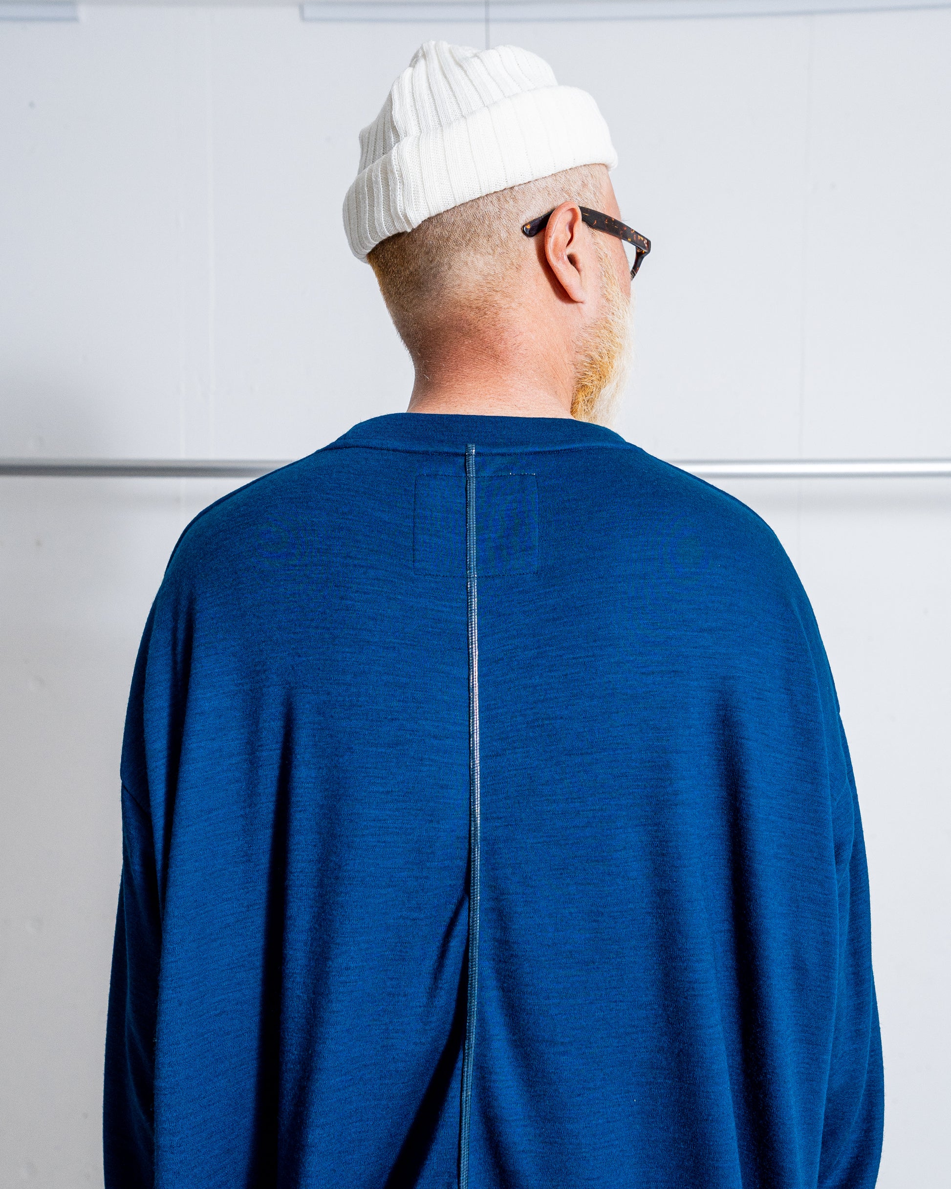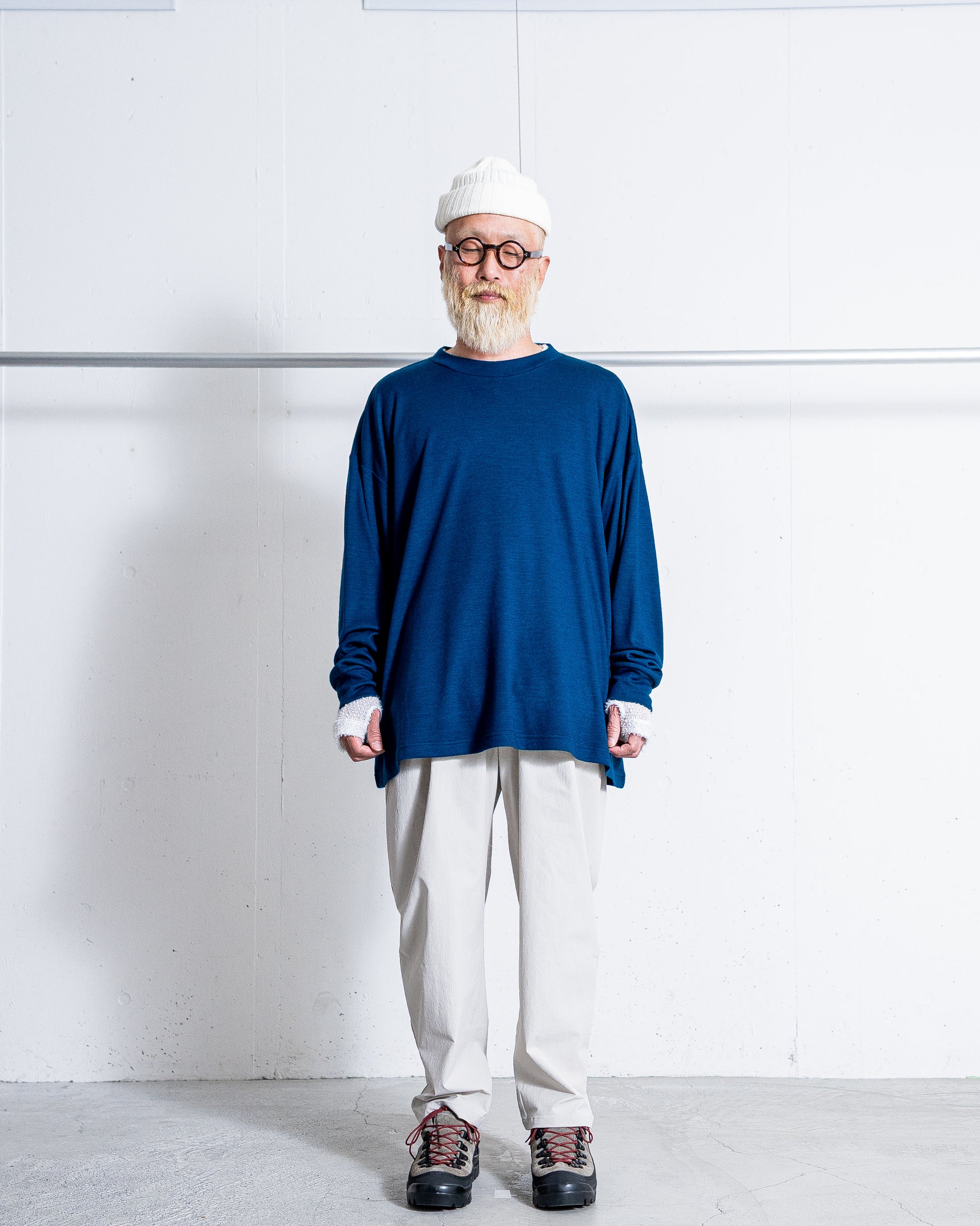 生地の持つ自然なドレープを活かした、 余白のあるボックスシルエットが特徴の ウールTシャツ。 素材には、日本有数の織物産地・尾州で 丁寧に編み立てられた、ウール100%の スムース天竺を採用。 艶やかで滑らかな肌触りに加え、クリアな表情と 上品な落ち感、適度なハリを兼ね備えた、 高級感あふれるファブリックです。 身体の動きに合わせてしなやかに揺れる その佇まいは、リラックス感の中にも 洗練された都会的な印象を宿します。 背面には背中心に縫い目を走らせ、 インサイドアウト仕様で仕立てた上に、 アクセントとしてテープを配し、 さりげない個性を加えました。 自宅での洗濯も可能で、ウール本来の持つ 抗菌性・防臭性により臭いも出にくく 清潔に着用できる、ワードローブとして 最適な一着。