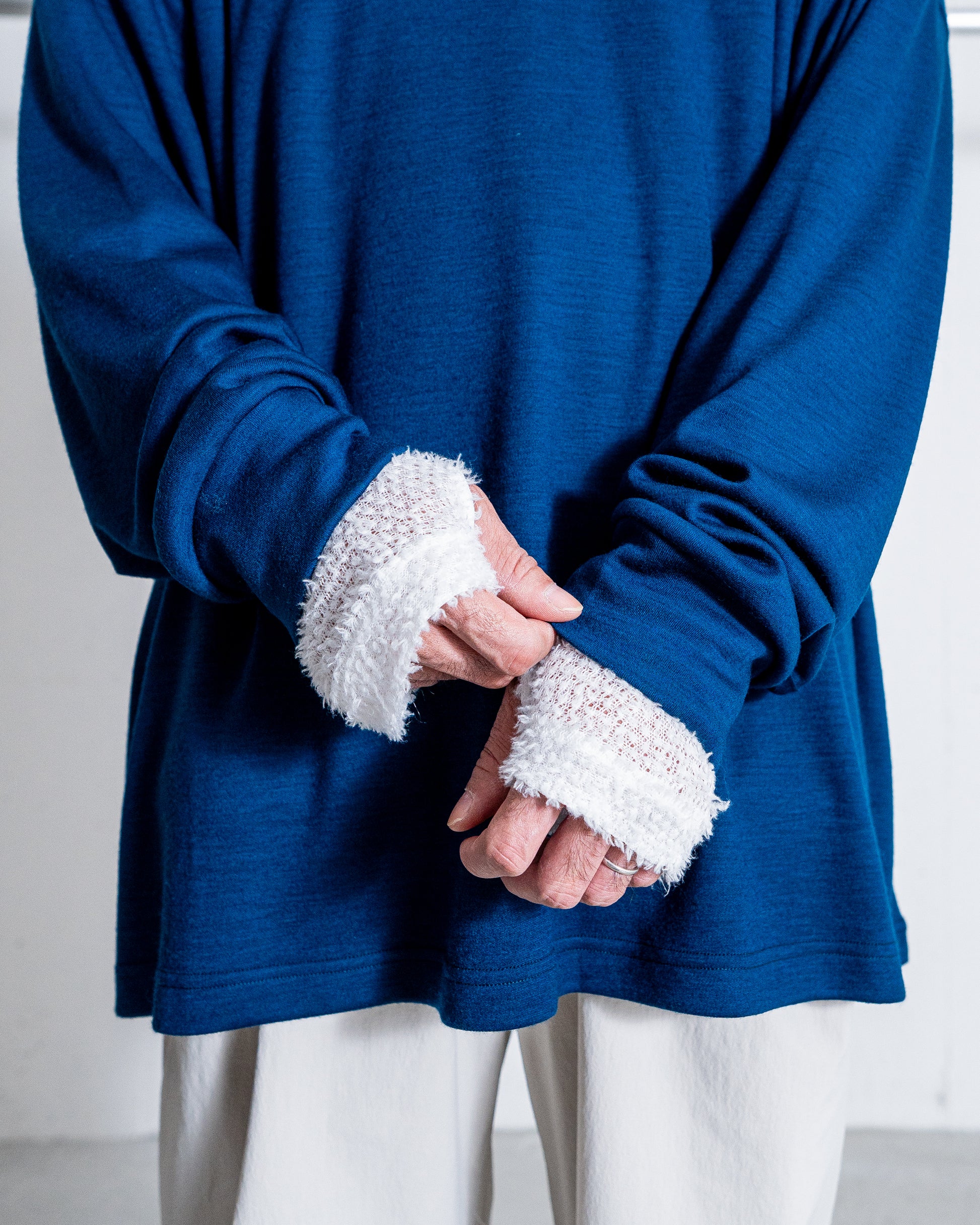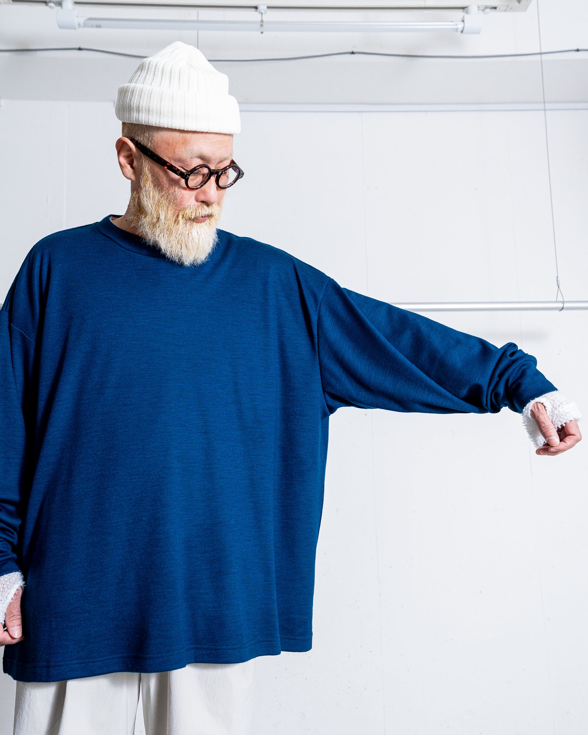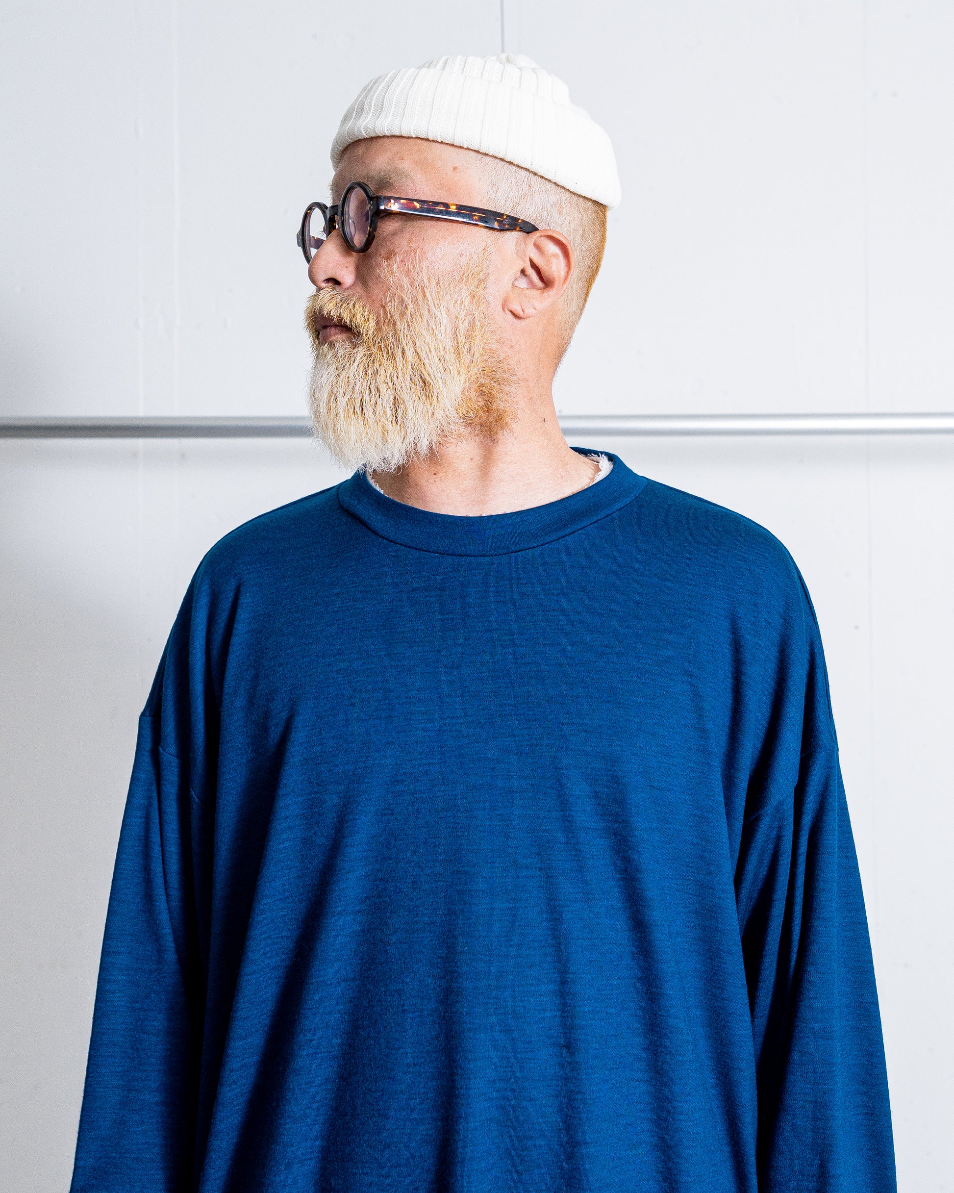 生地の持つ自然なドレープを活かした、 余白のあるボックスシルエットが特徴の ウールTシャツ。 素材には、日本有数の織物産地・尾州で 丁寧に編み立てられた、ウール100%の スムース天竺を採用。 艶やかで滑らかな肌触りに加え、クリアな表情と 上品な落ち感、適度なハリを兼ね備えた、 高級感あふれるファブリックです。 身体の動きに合わせてしなやかに揺れる その佇まいは、リラックス感の中にも 洗練された都会的な印象を宿します。 背面には背中心に縫い目を走らせ、 インサイドアウト仕様で仕立てた上に、 アクセントとしてテープを配し、 さりげない個性を加えました。 自宅での洗濯も可能で、ウール本来の持つ 抗菌性・防臭性により臭いも出にくく 清潔に着用できる、ワードローブとして 最適な一着。