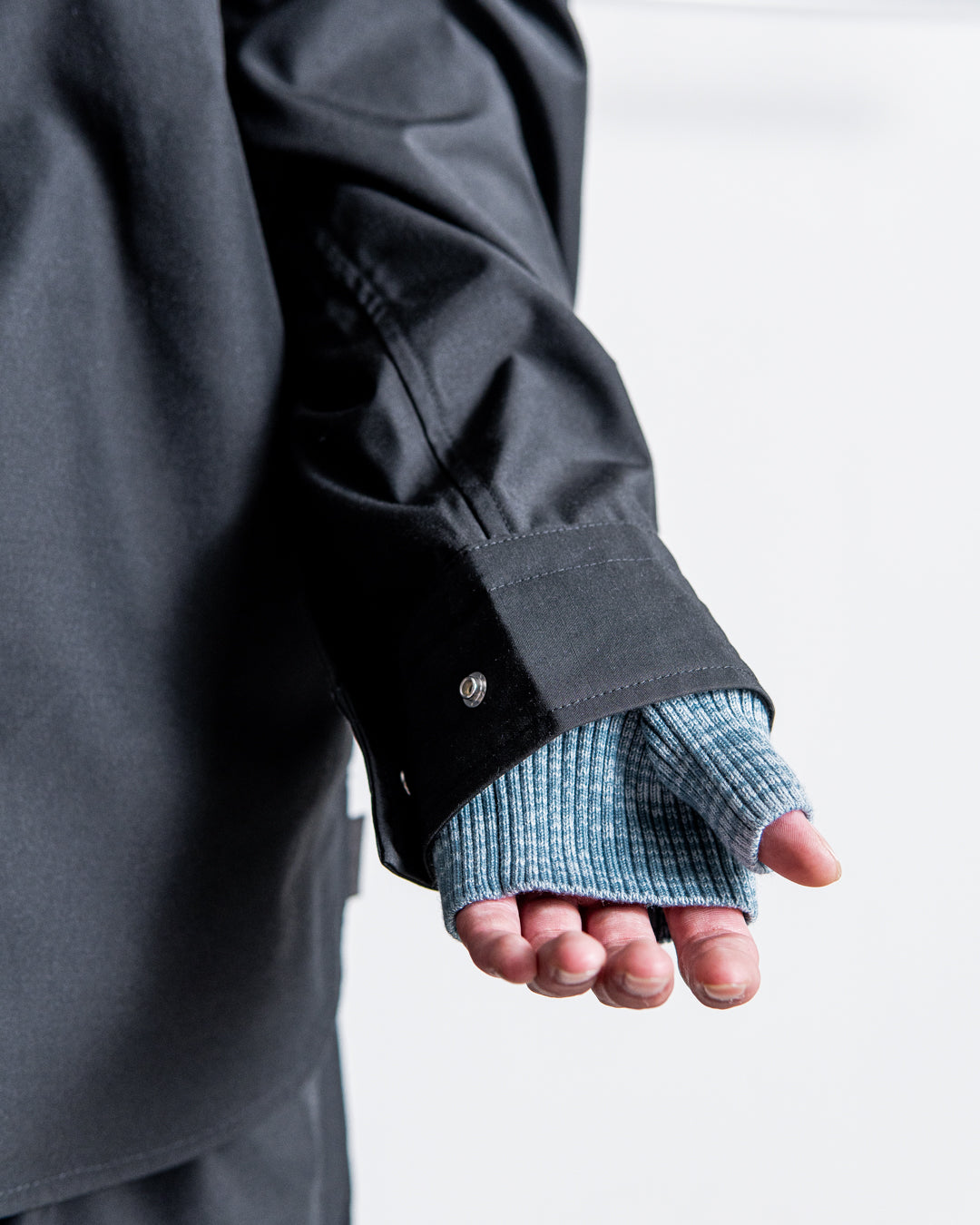 Design: ウールをミックスした高密度の合繊素材を使用したフーディーシャツジャケット。ドットボタンを比翼仕立てに、ポケットはコンシールファスナーを採用、フードはコンパクトに設計しミニマムに仕上げました。